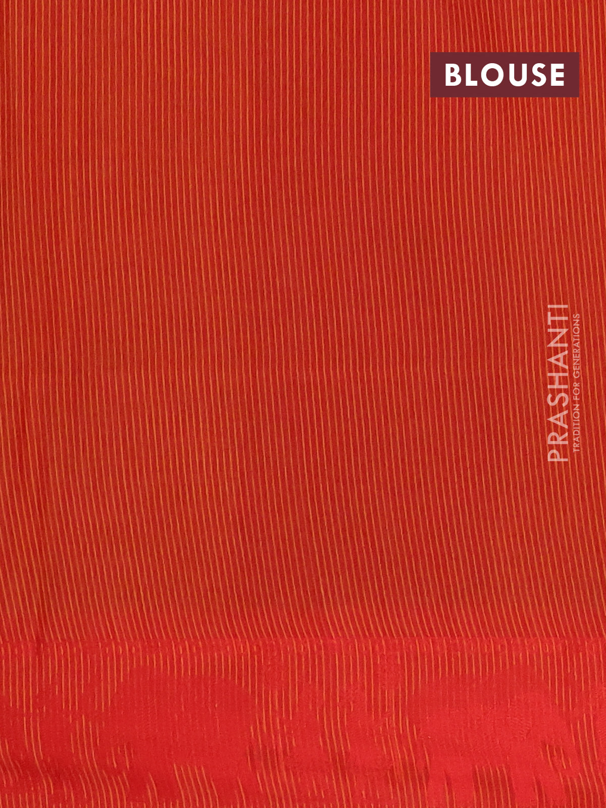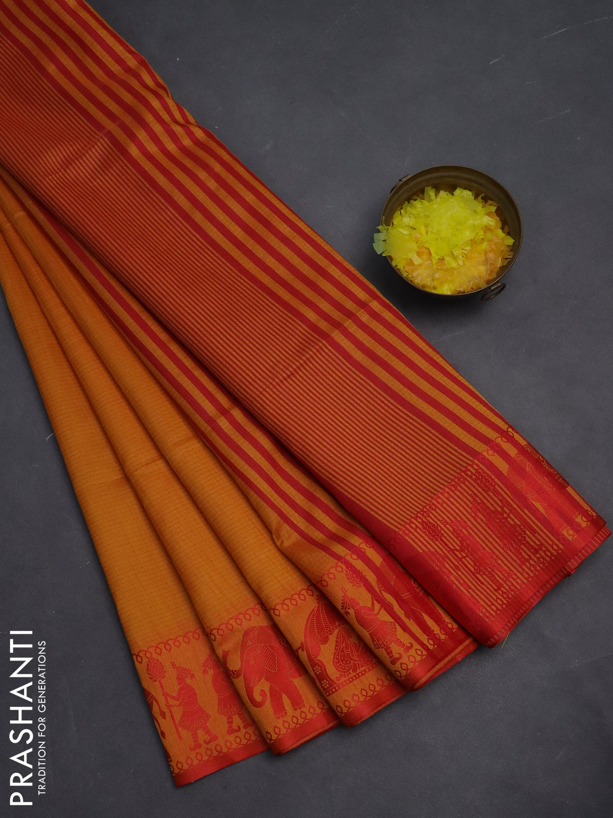 Semi dupion saree mango yellow and maroon with allover stripe pattern and thread woven border