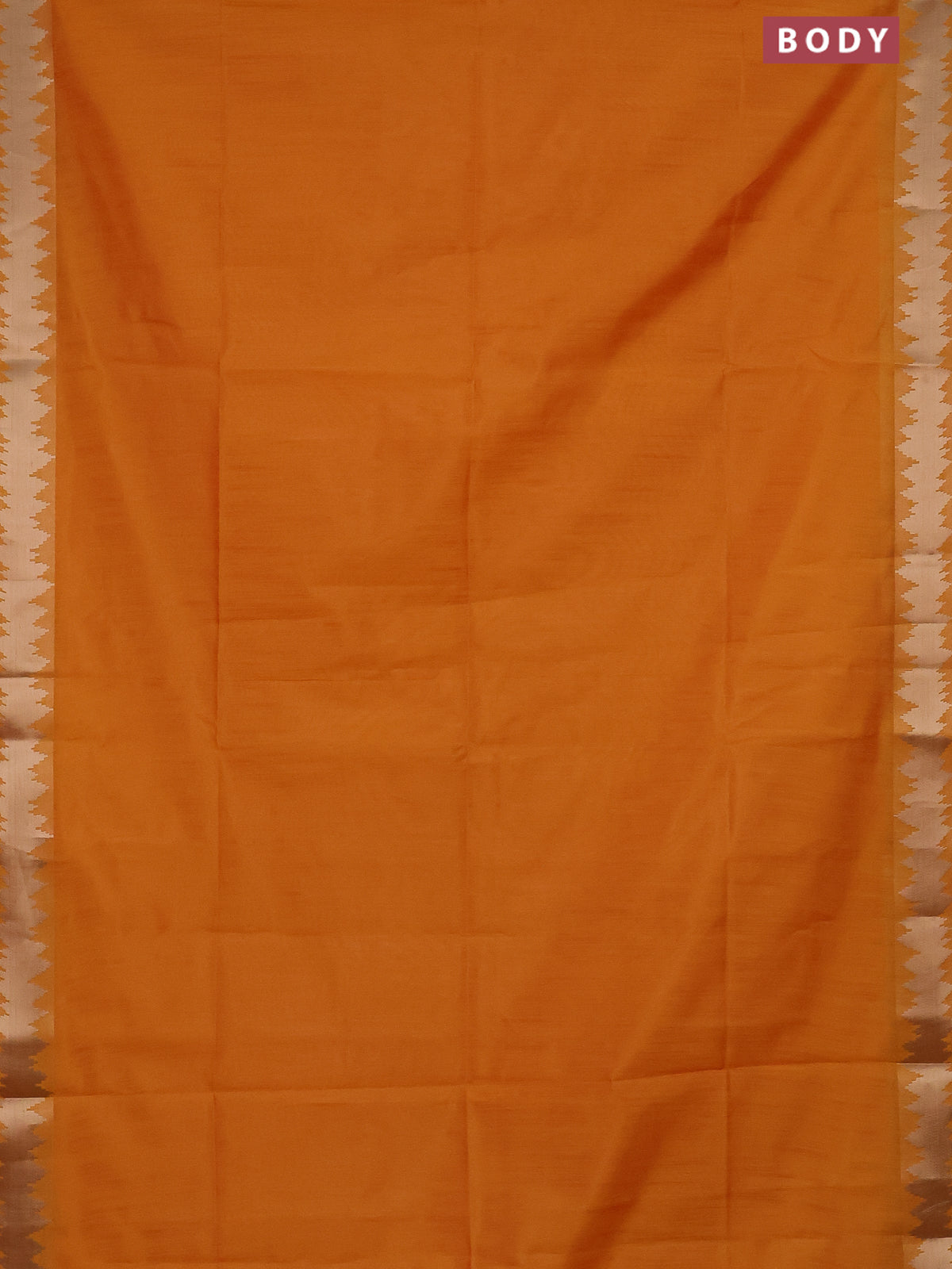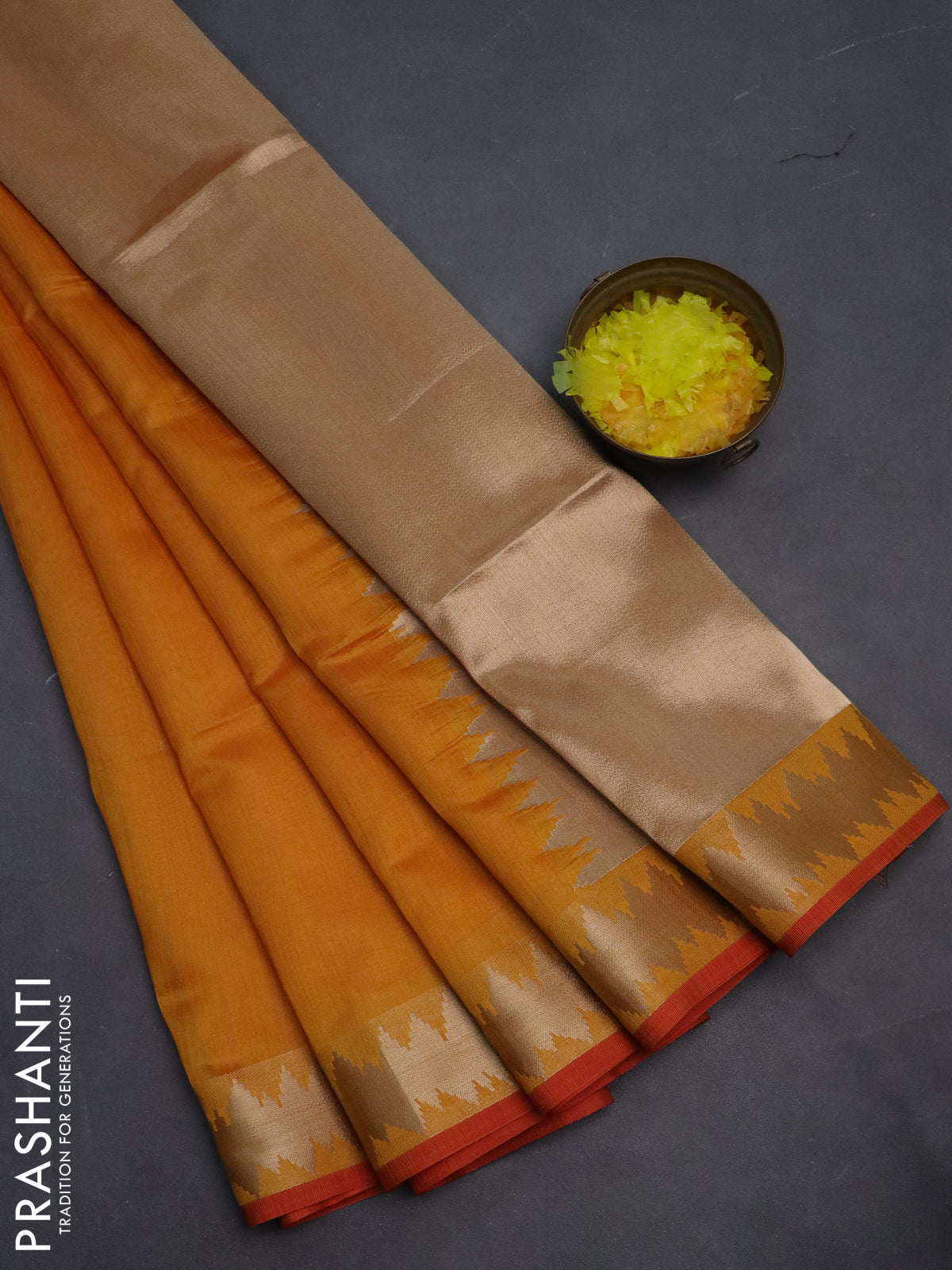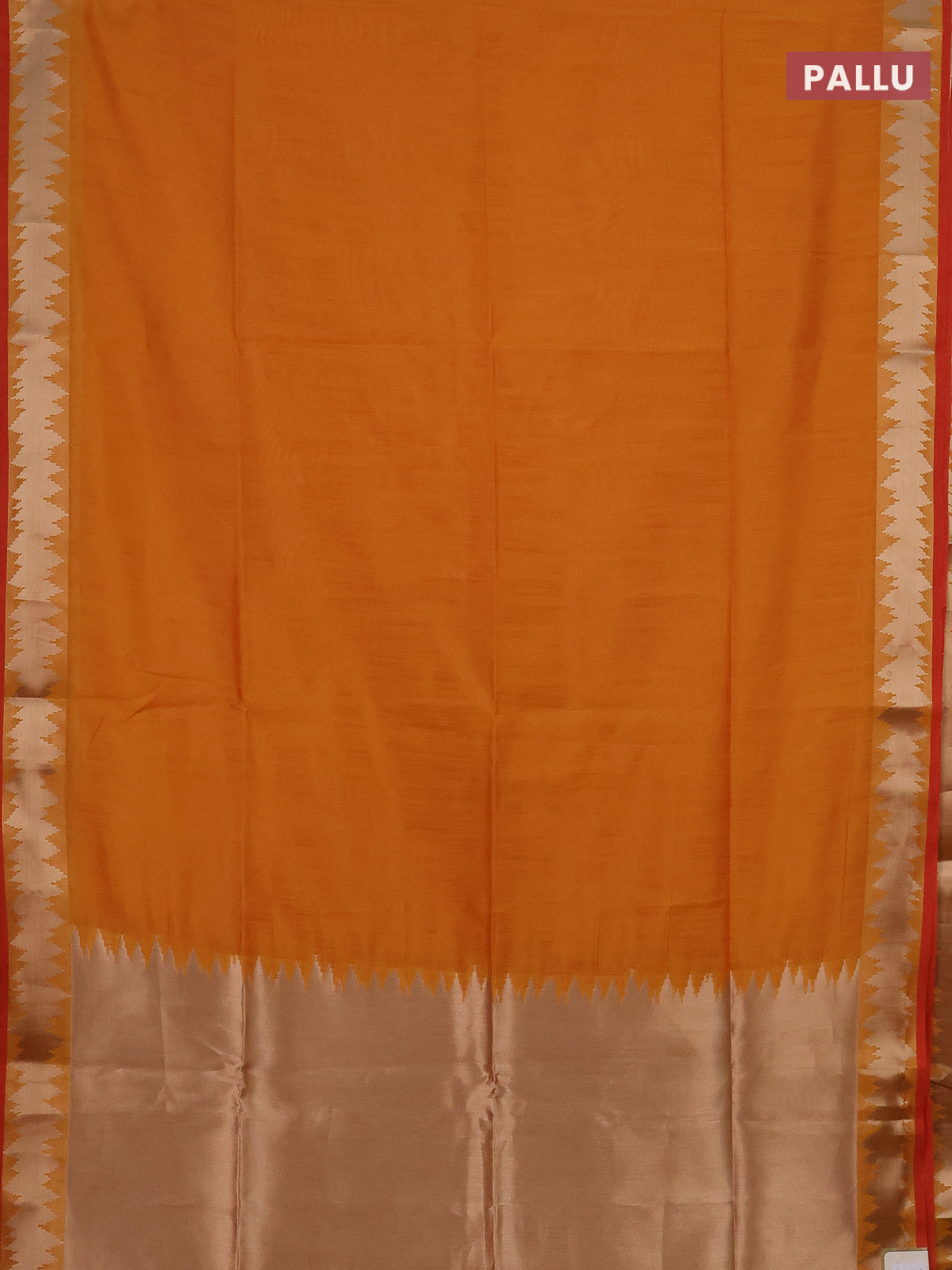 Semi dupion saree mango yellow and orange with plain body and temple design zari woven border