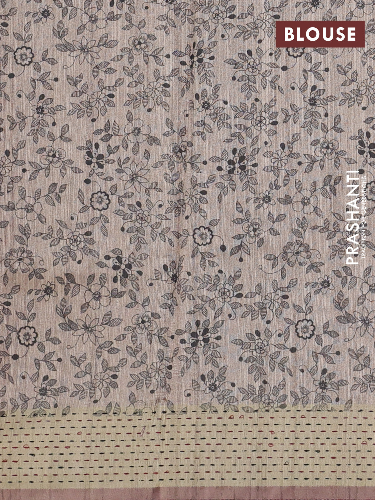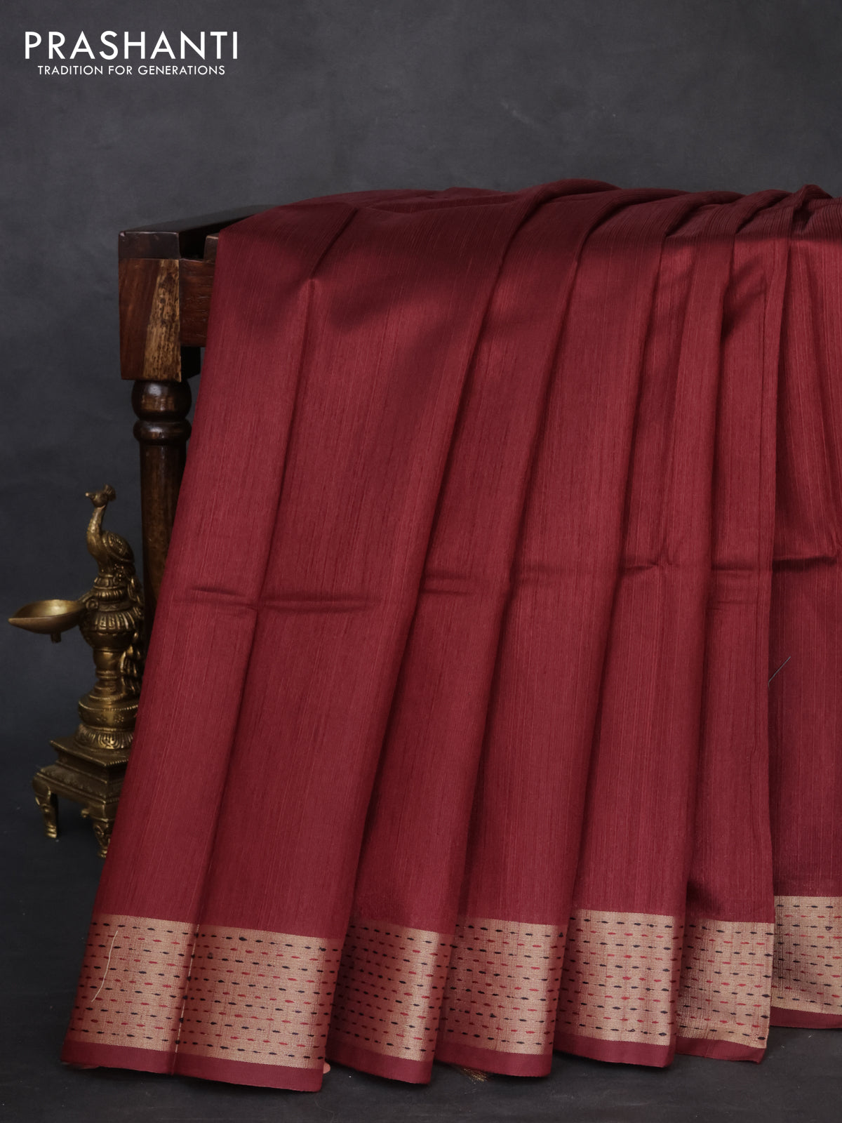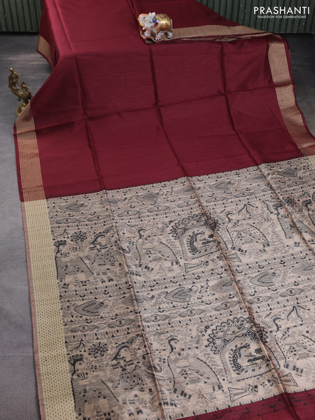 Semi dupion saree maroon and beige with plain body and madhubani printed pallu