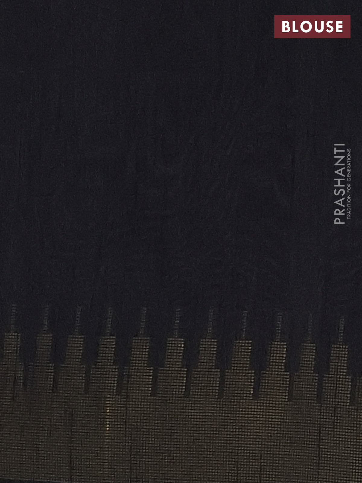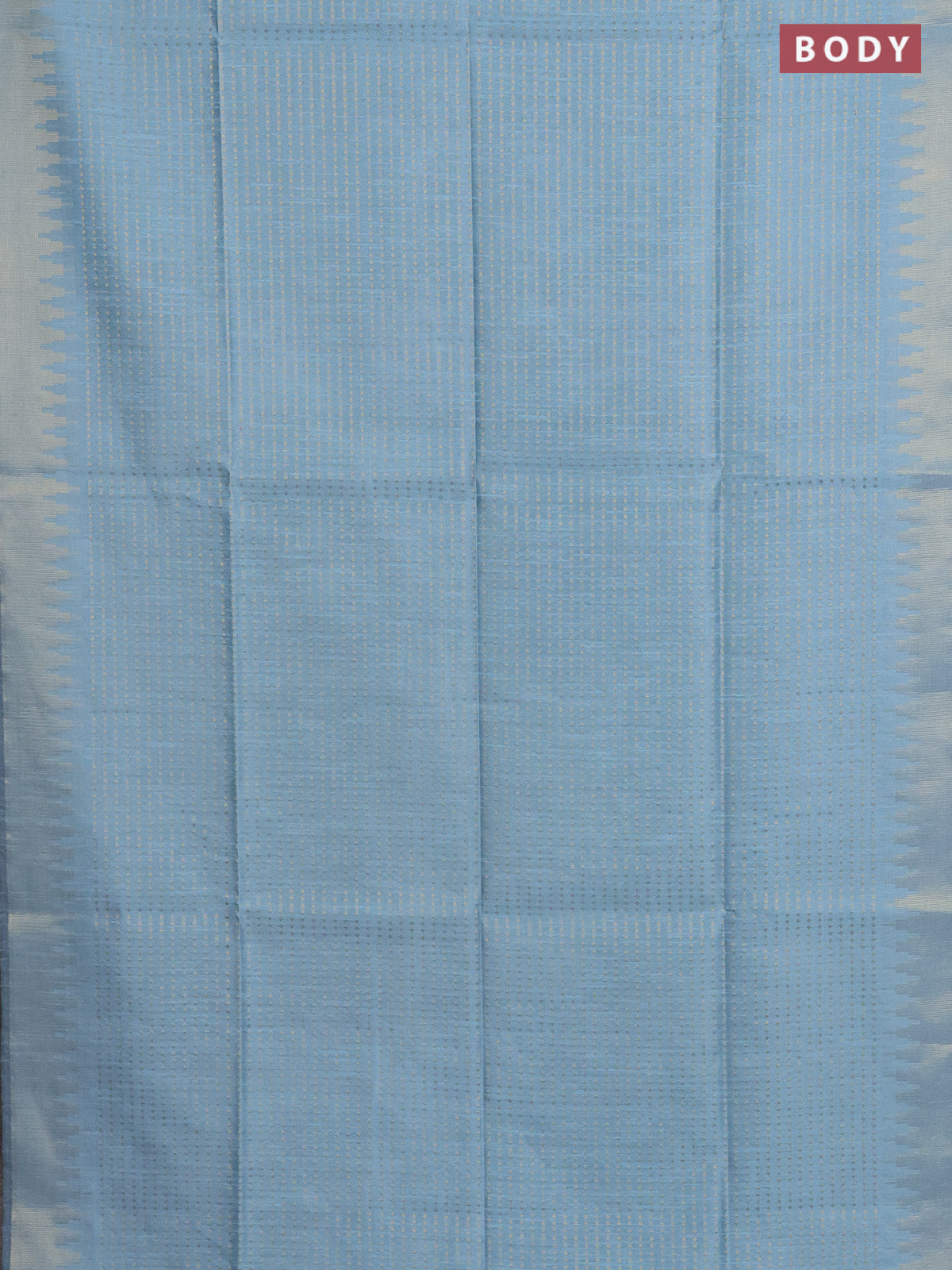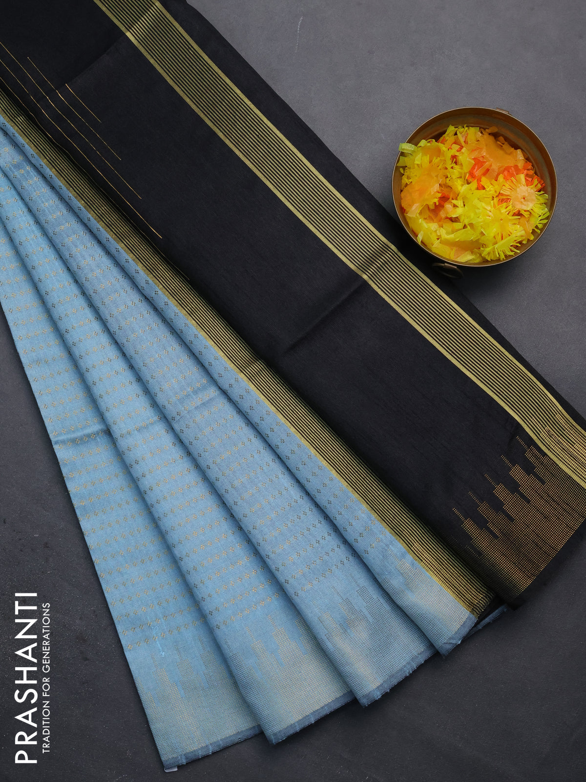 Semi dupion saree pastel blue and black with allover zari woven butta weaves and temple design zari woven border
