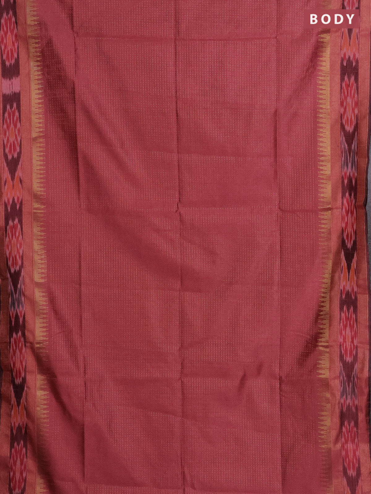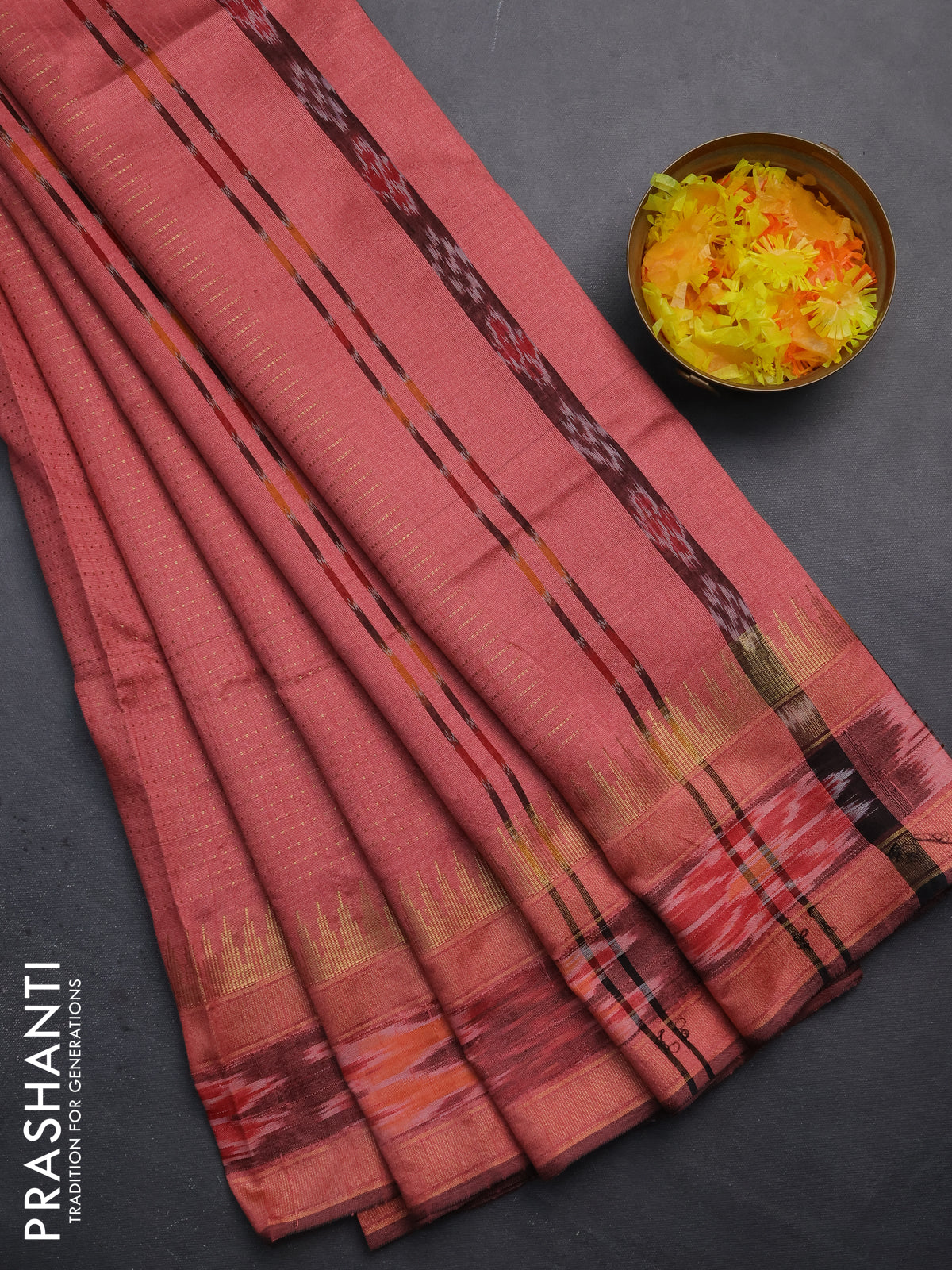 Semi dupion saree peach shade with allover zari weaves and temple design zari woven ikat border