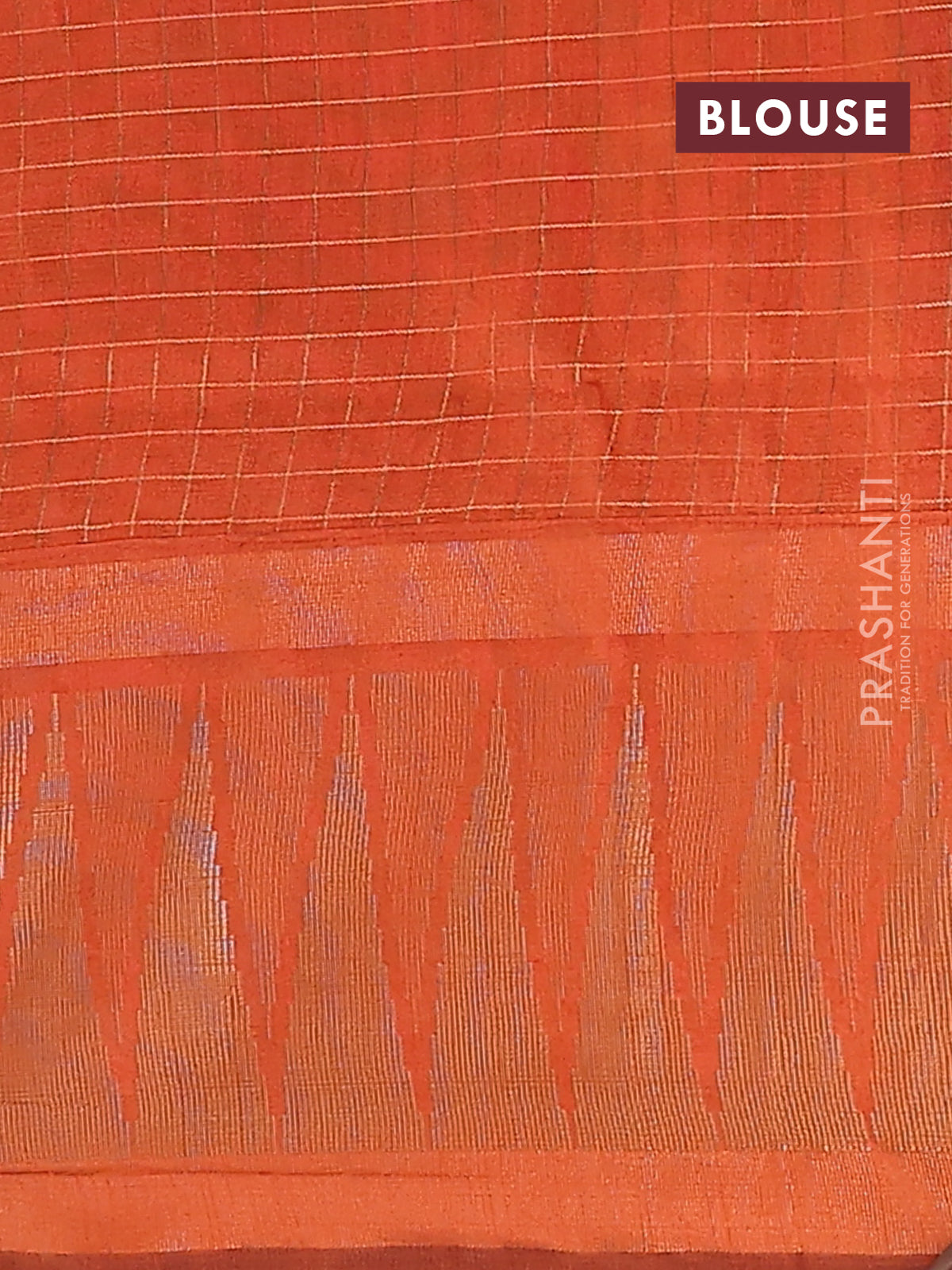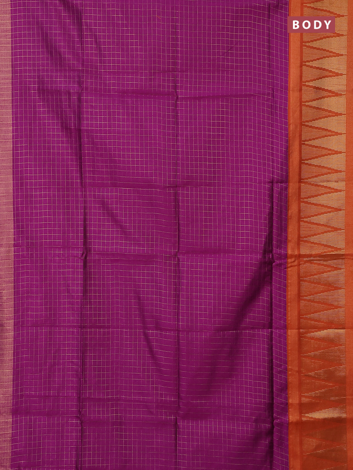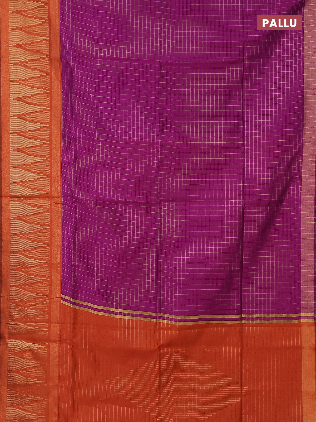 Semi dupion saree purple and orange with allover zari checked pattern and long temple zari woven border