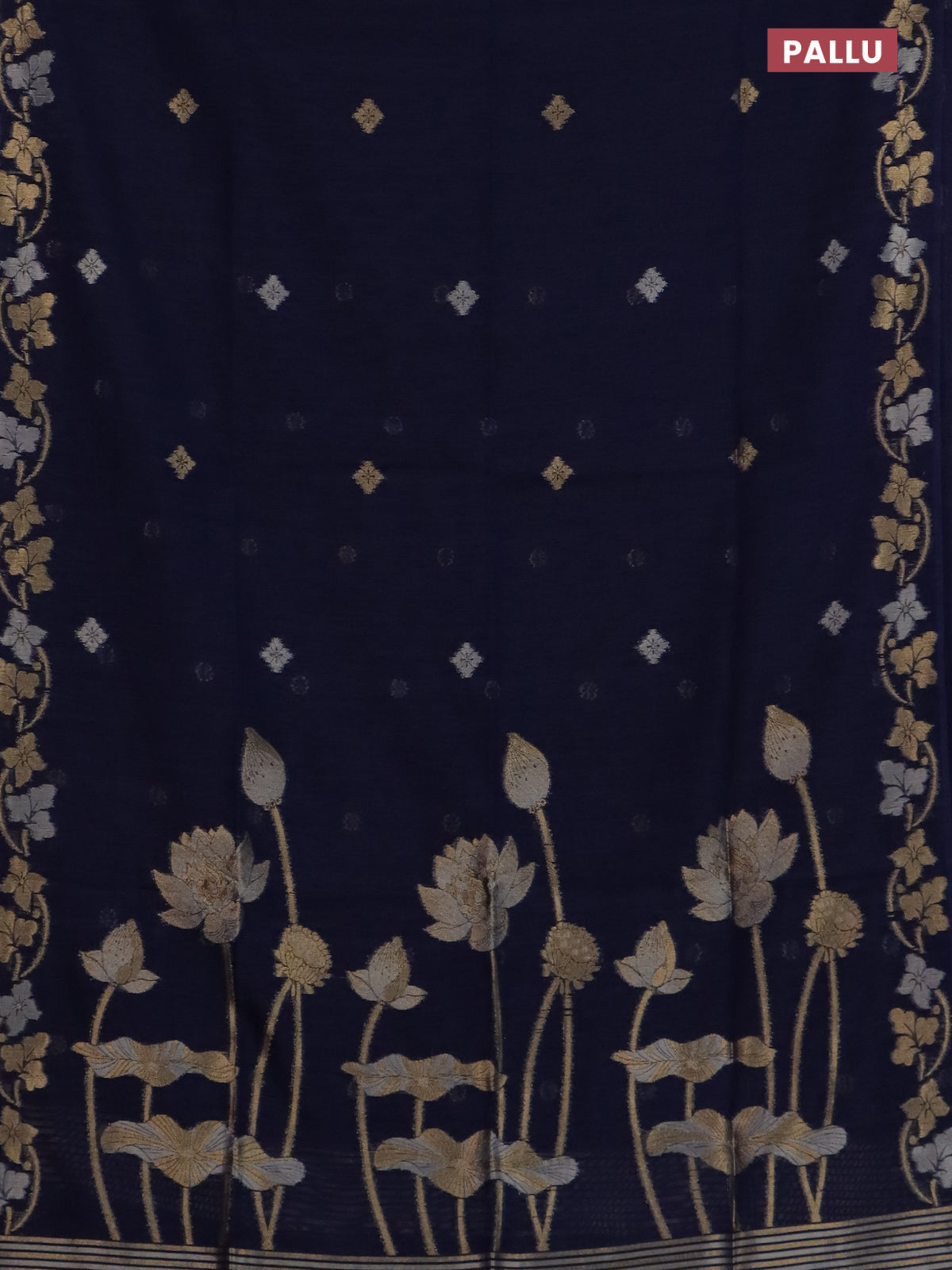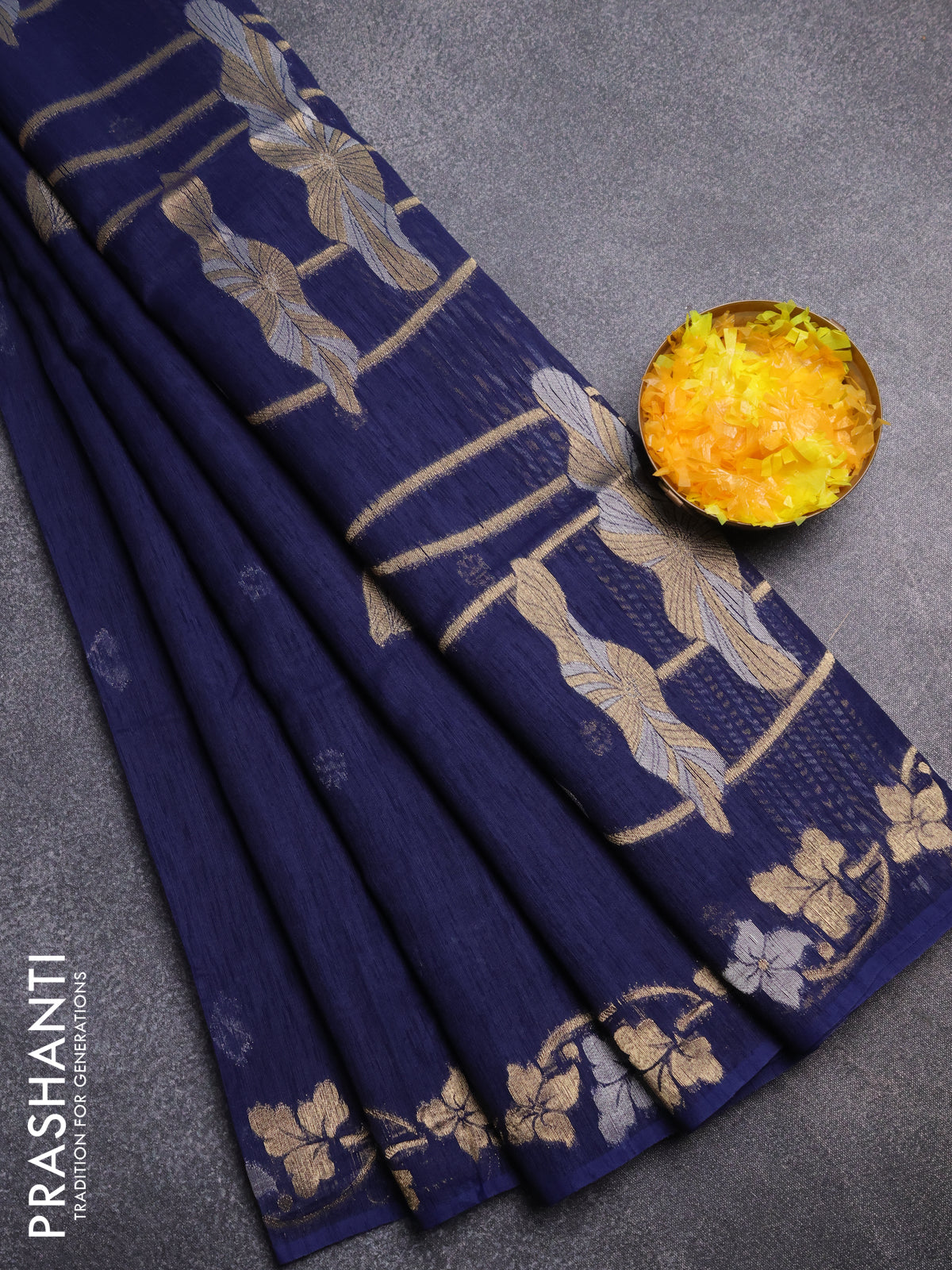Semi jute linen saree navy blue with silver & gold zari woven buttas and zari woven border