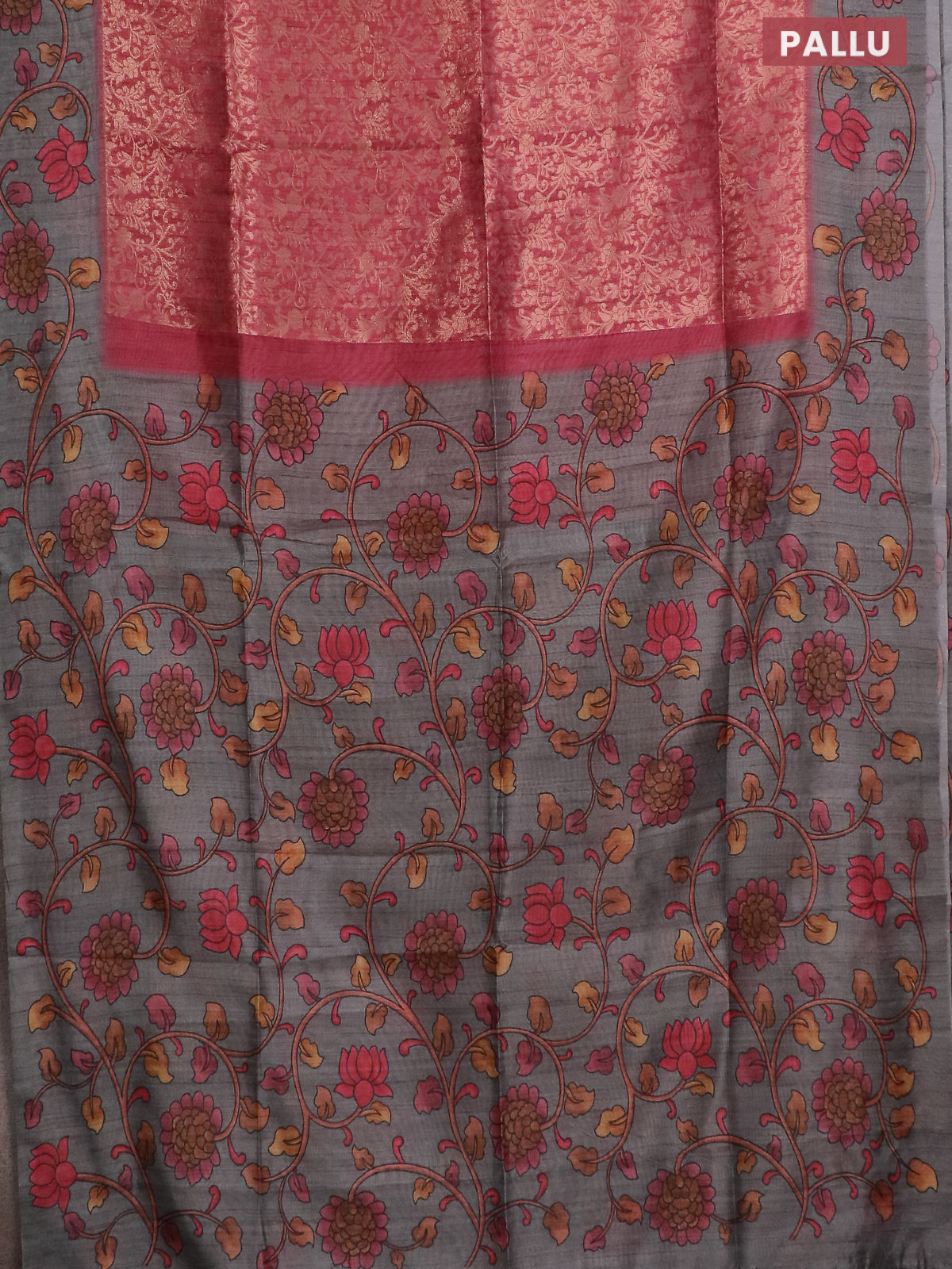 Semi jute silk saree maroon and grey with allover zari woven brocade weaves and kalamkari printed pallu