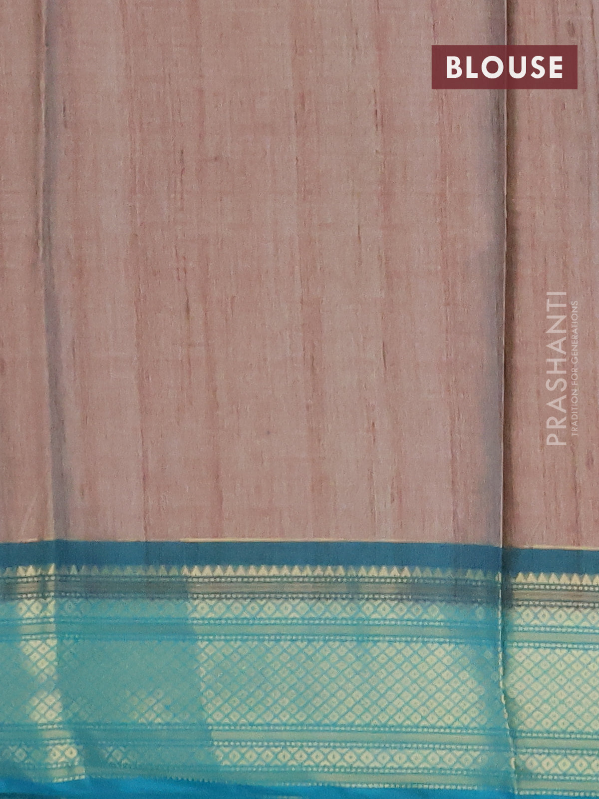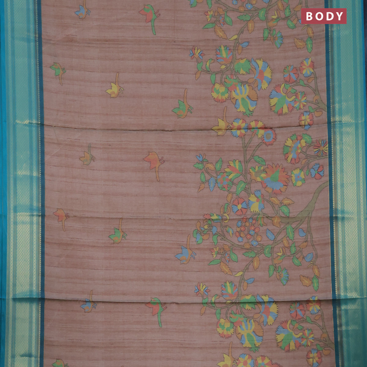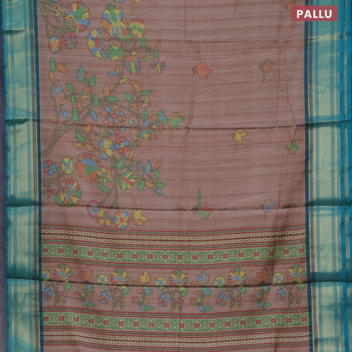 Semi kanchipuram silk saree beige and teal green with allover digital prints and zari woven border