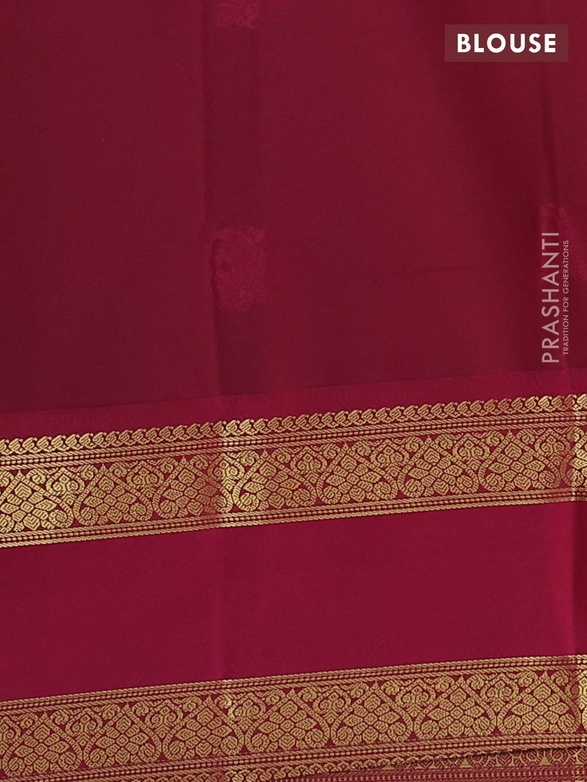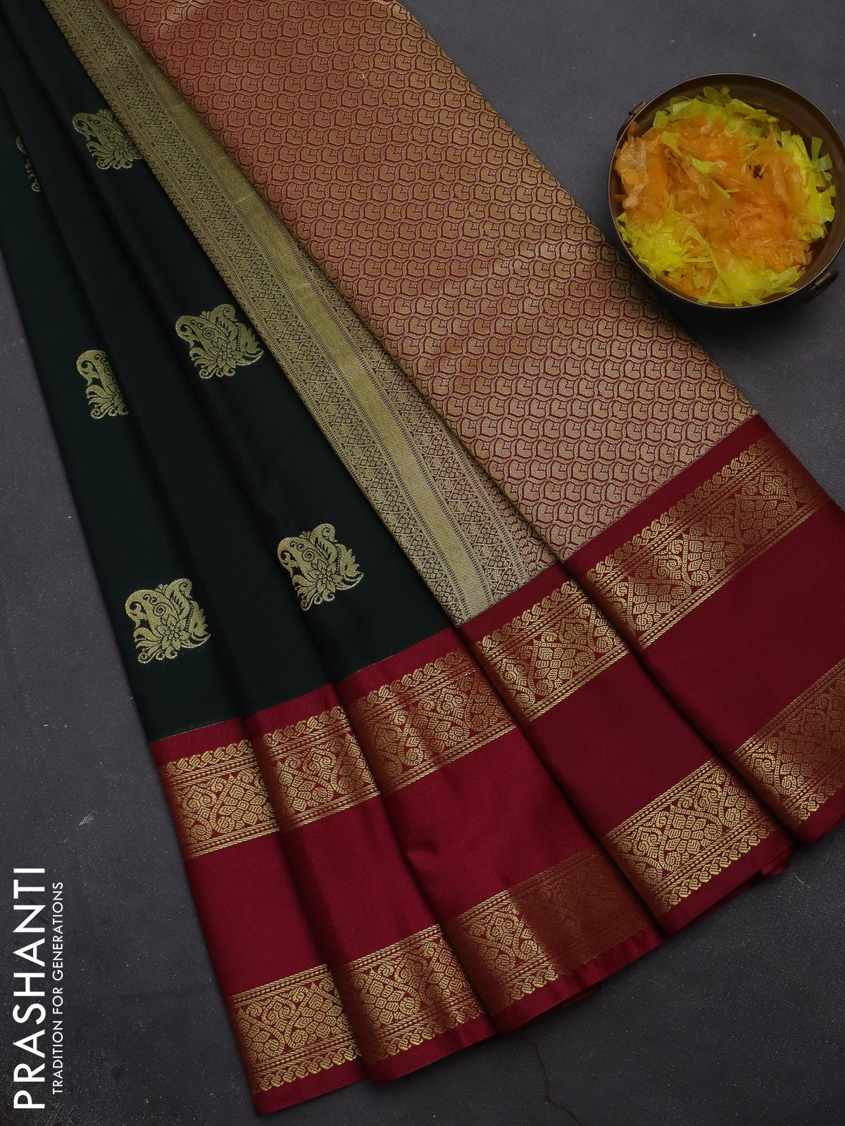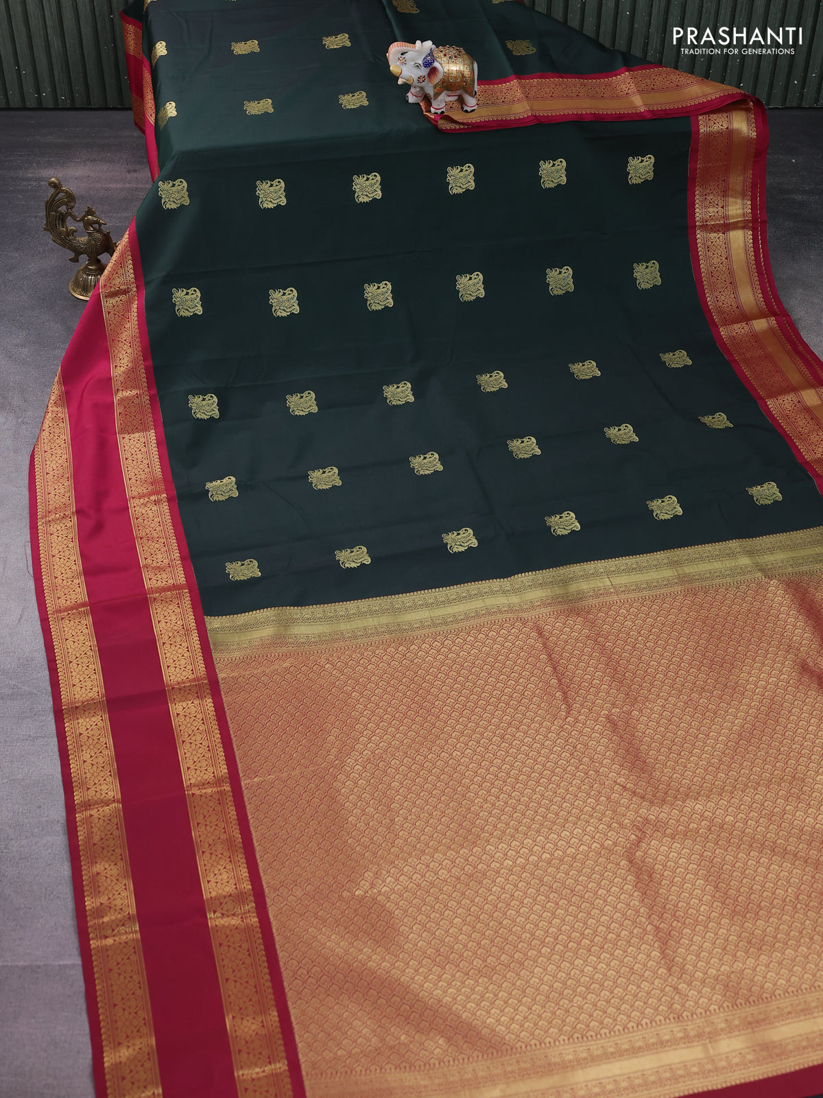 Semi kanchipuram silk saree bottle green and pink with zari woven buttas and rettapet zari woven korvai border