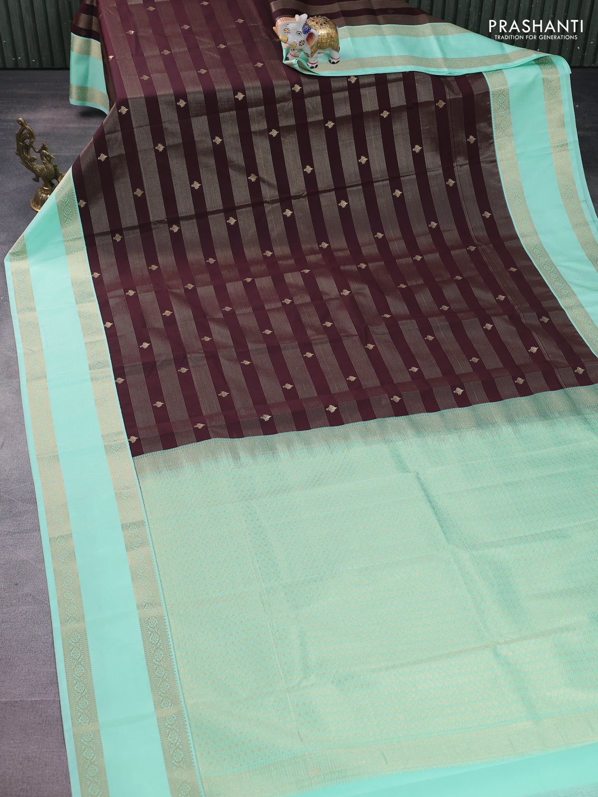 Semi kanchipuram silk saree brown and teal green with allover zari weaves & buttas and rettapet zari woven korvai border