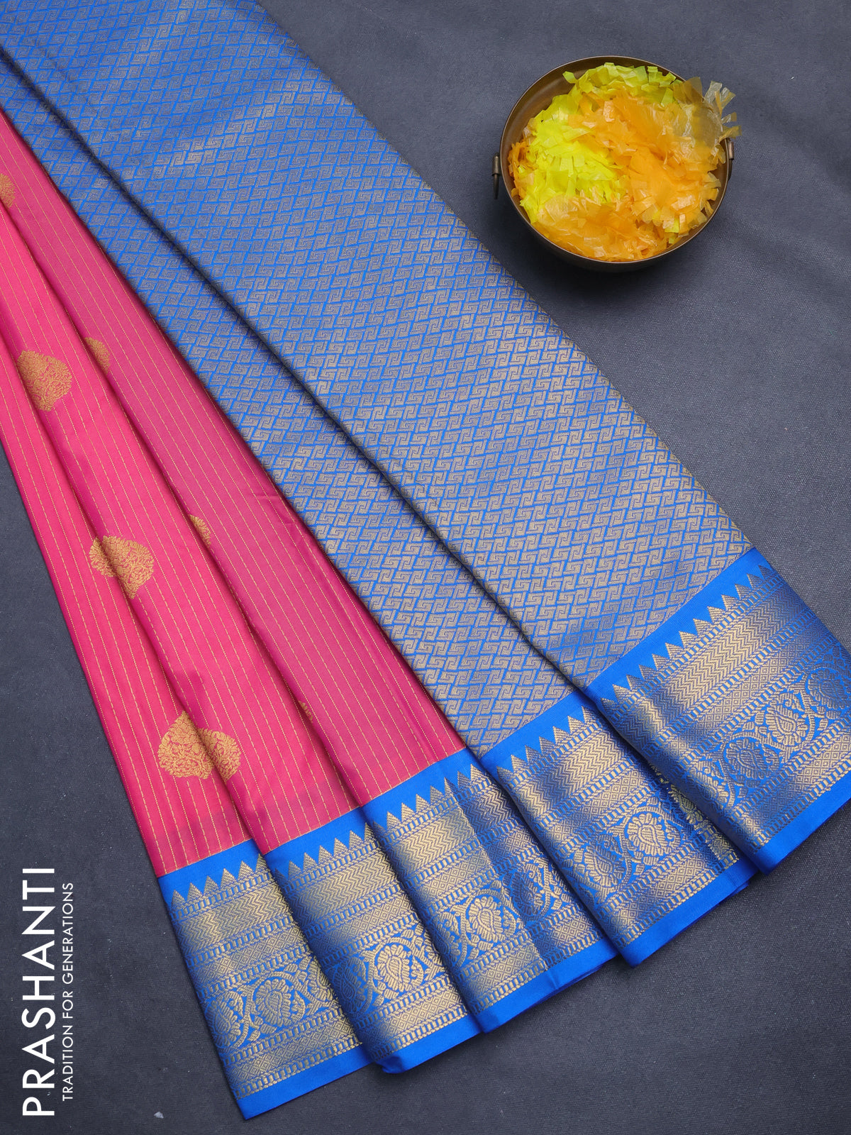 Semi kanchipuram silk saree candy pink and blue with allover zari weaves & buttas and zari woven korvai border