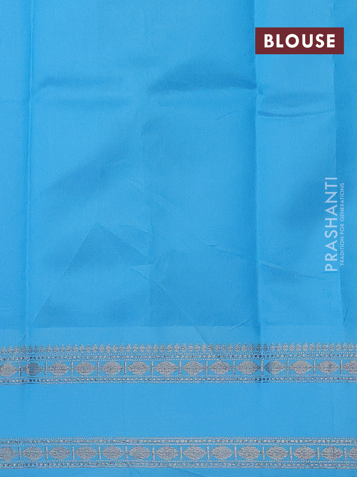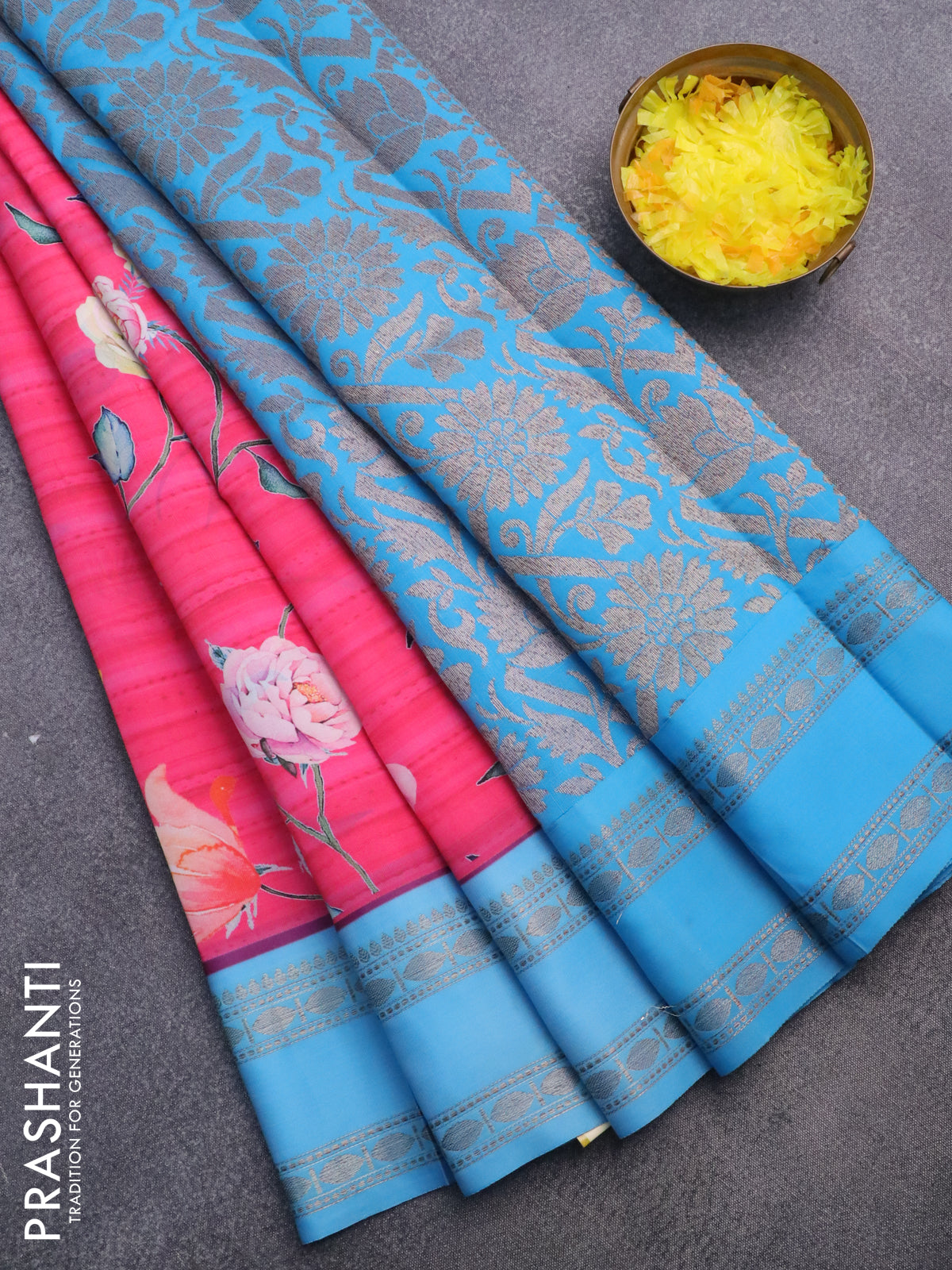 Semi kanchipuram silk saree candy pink and light blue with allover floral digital prints and rettapet woven border