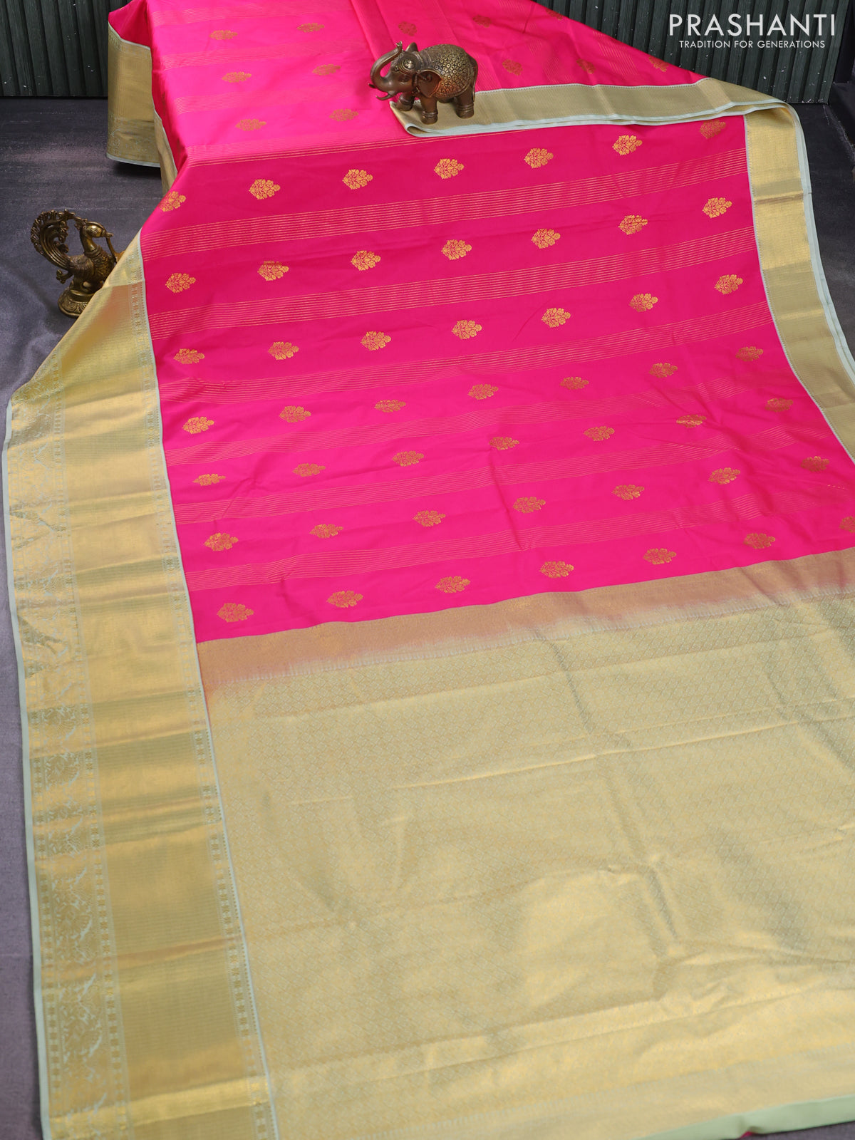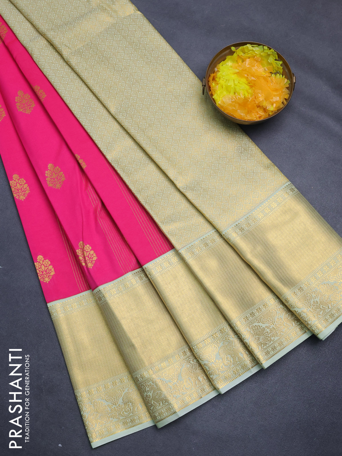 Semi kanchipuram silk saree candy pink and mild pista green with allover zari weaves & buttas and long zari woven korvai border