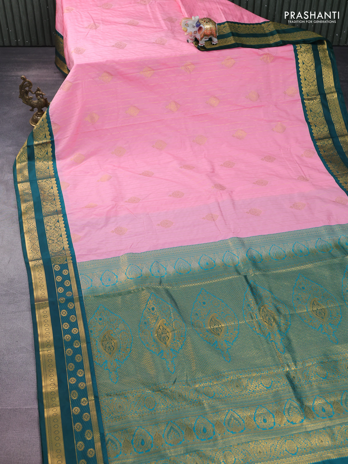 Semi kanchipuram silk saree candy pink and peacock green with allover zari weaves & buttas and zari woven korvai border