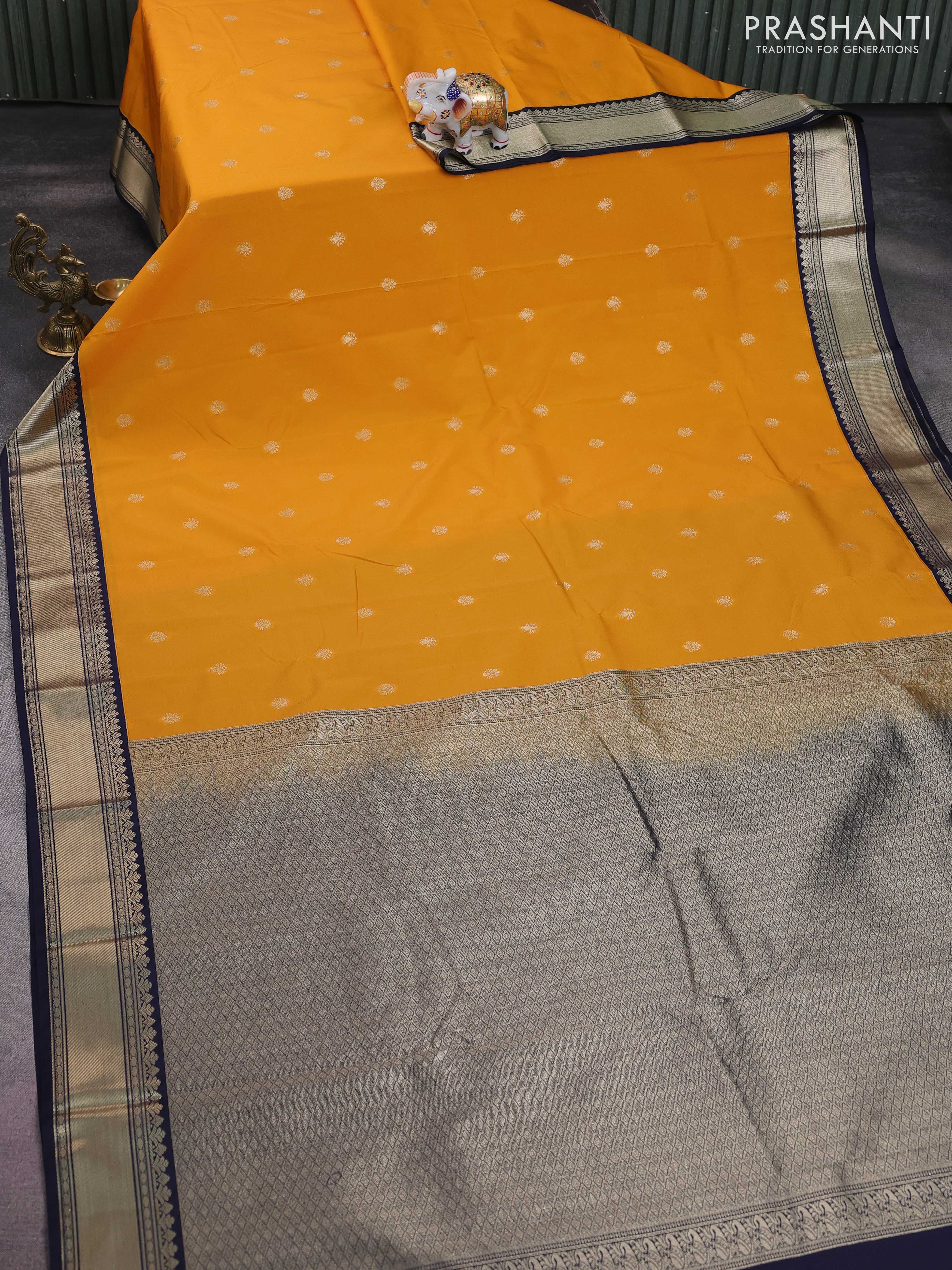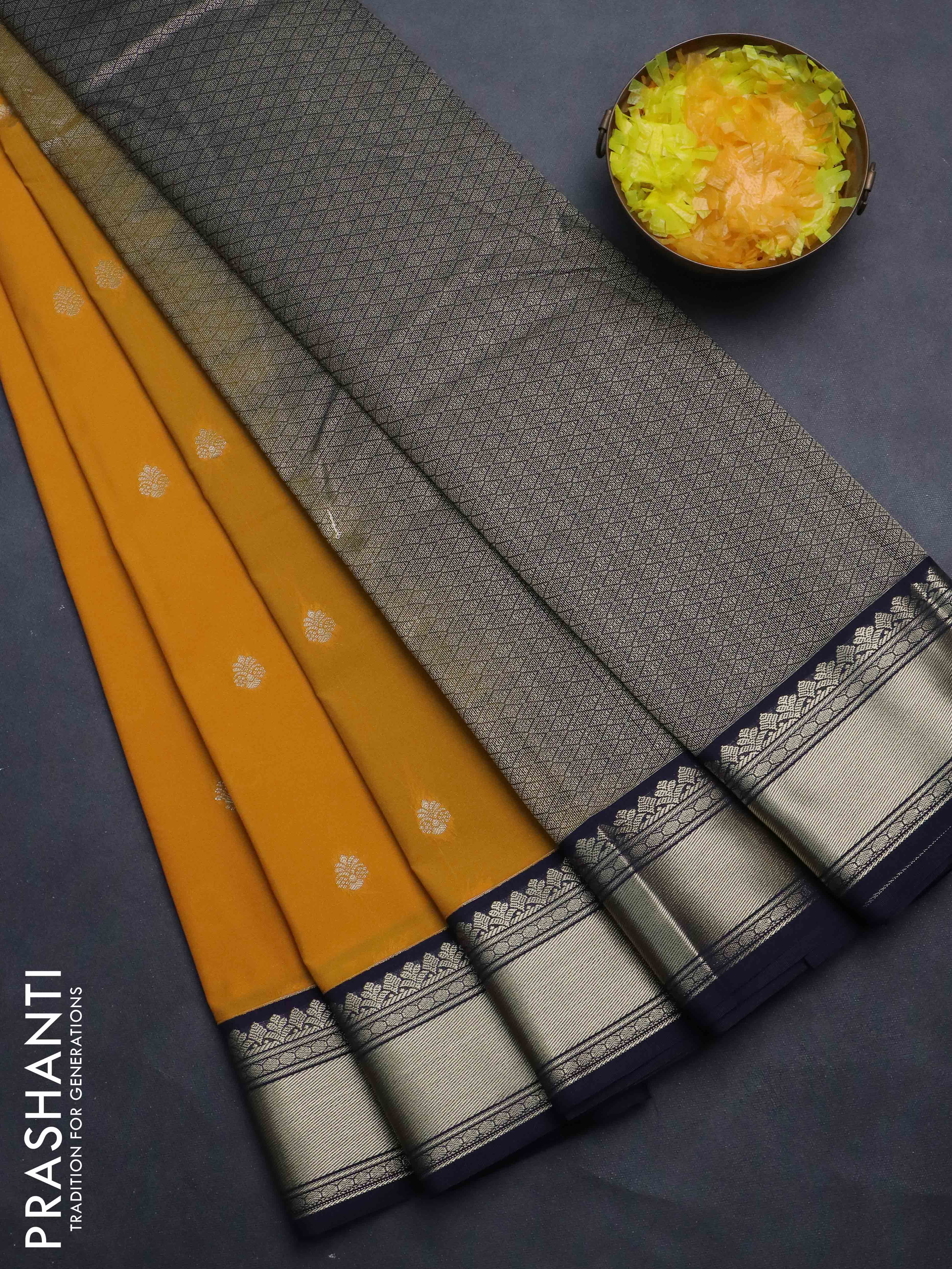 Semi kanchipuram silk saree dark mustard and navy blue with zari woven buttas and zari woven korvai border