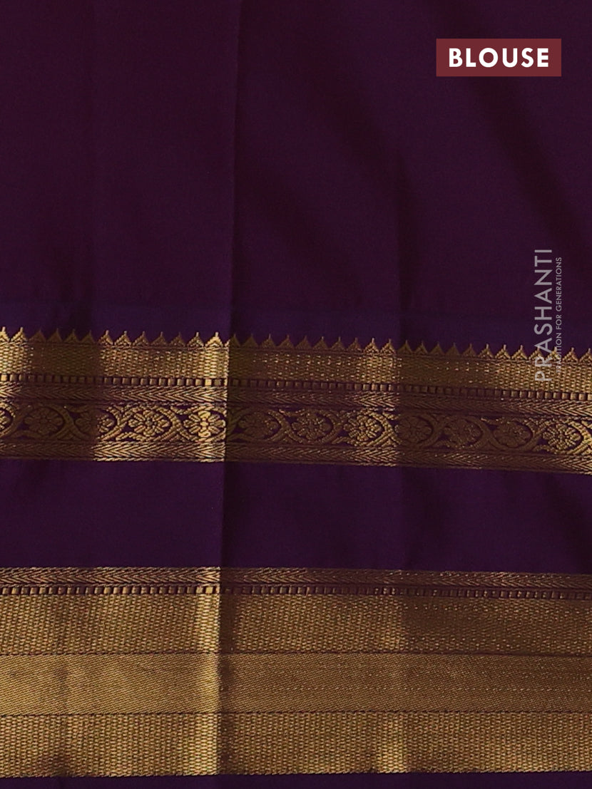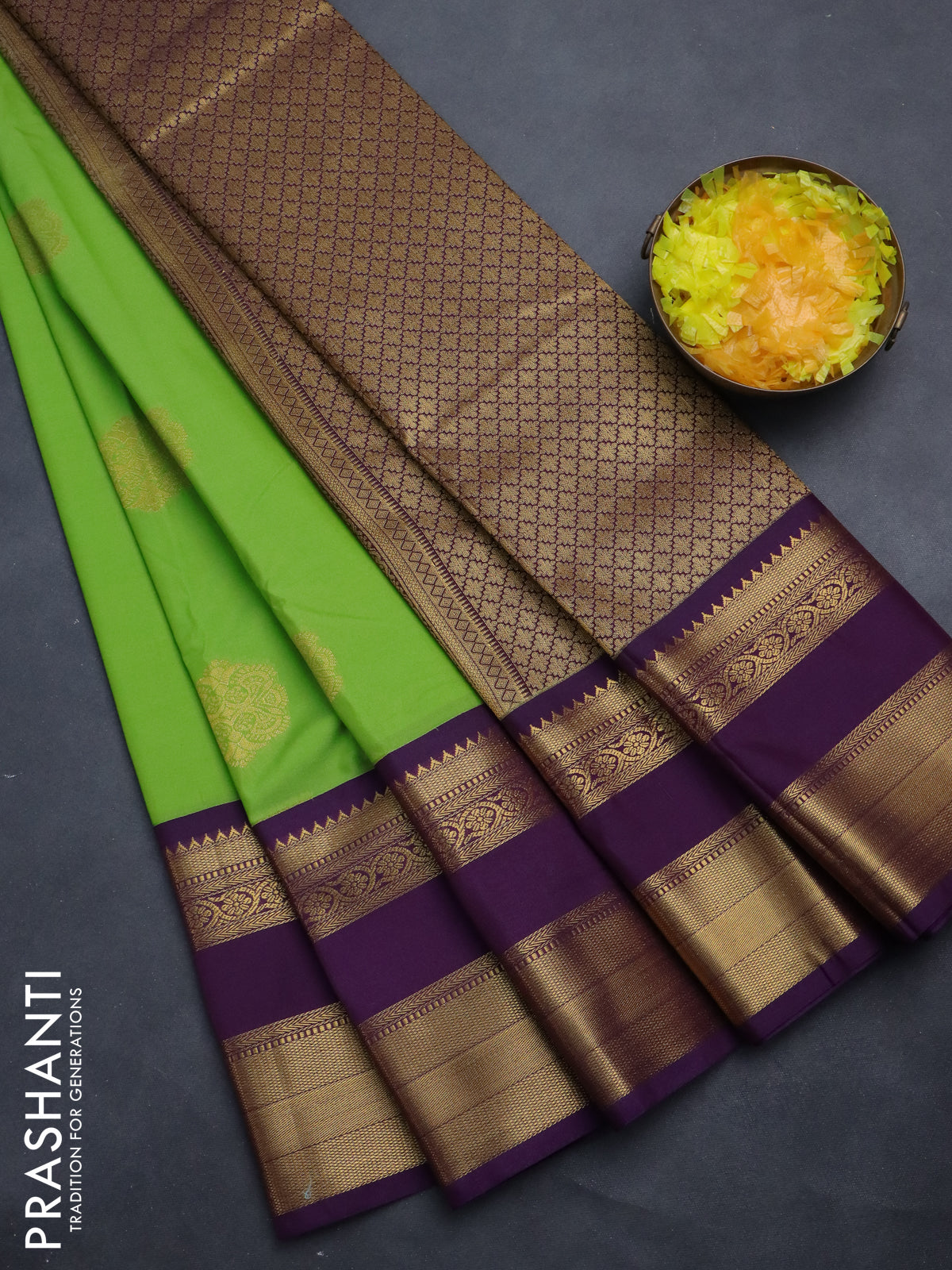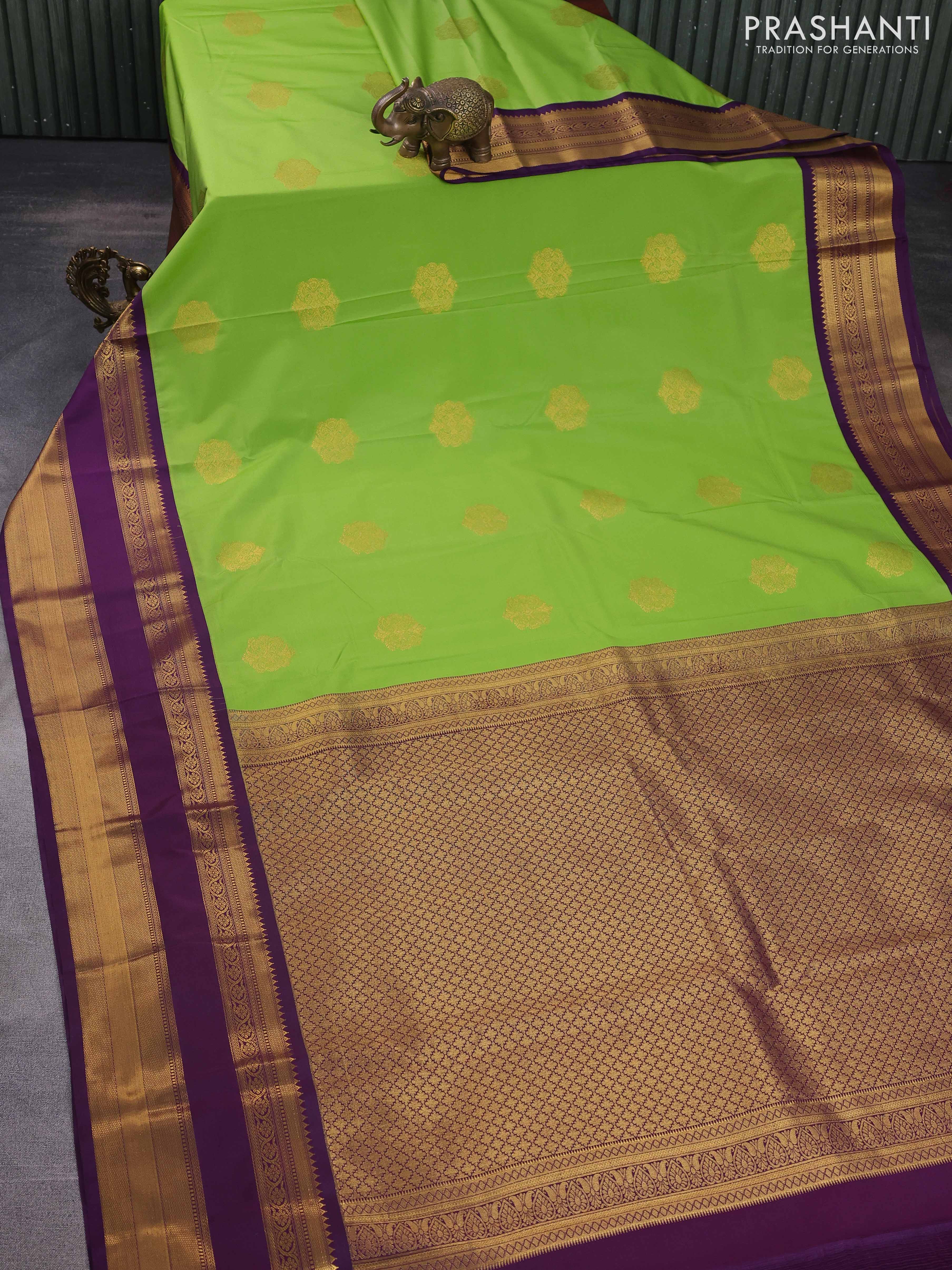 Semi kanchipuram silk saree green and purple with zari woven buttas and long rettapet zari woven korvai border
