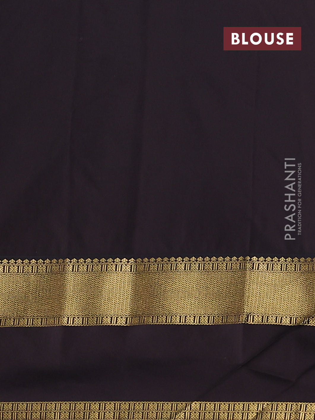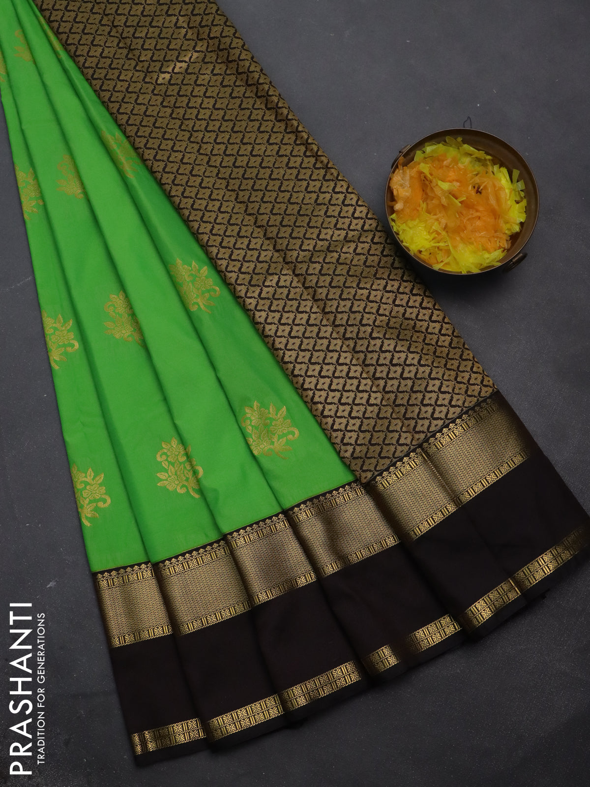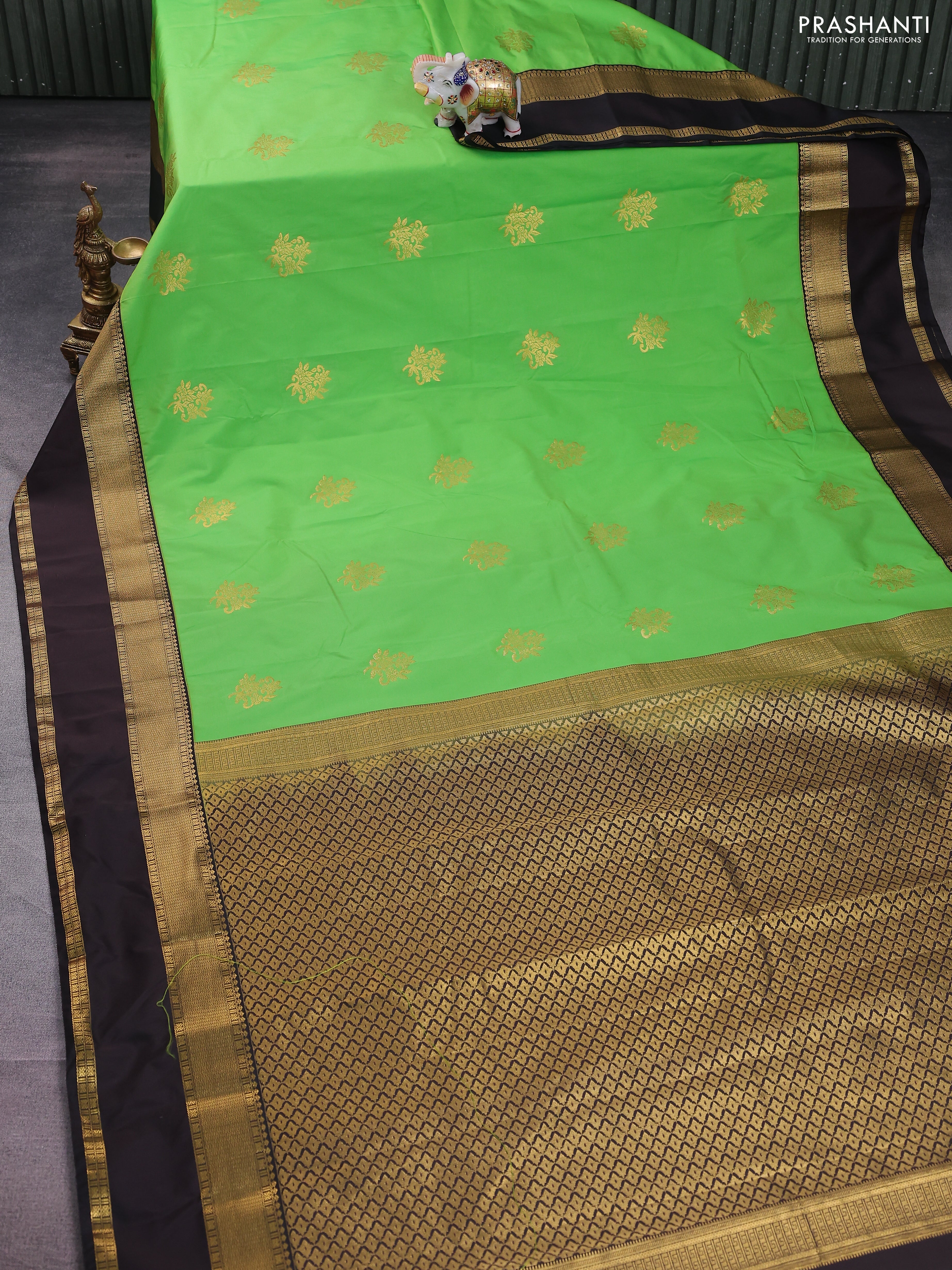 Semi kanchipuram silk saree light green and deep coffee brown with floral zari woven buttas and rettapet zari woven korvai border