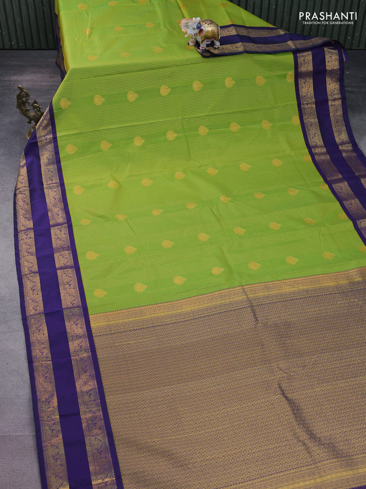 Semi kanchipuram silk saree light green and navy blue with allover small zari checks & buttas and rettapet zari woven korvai border