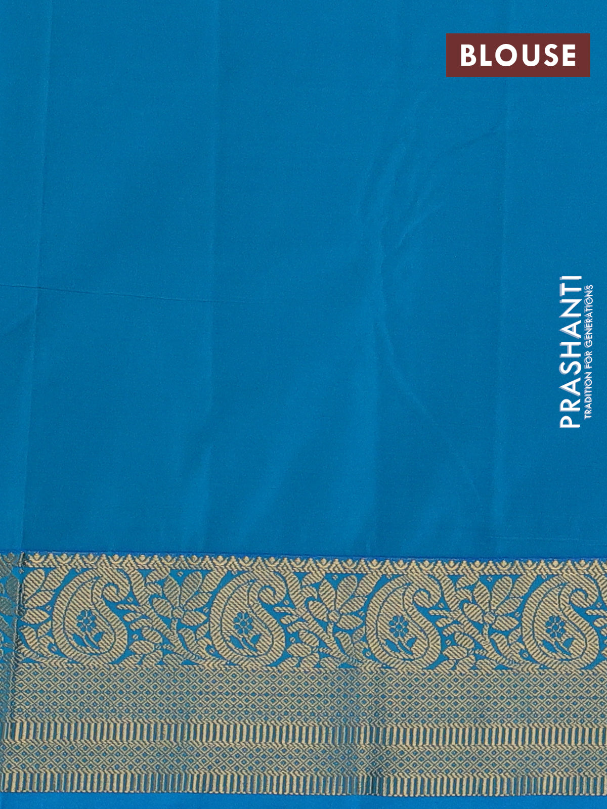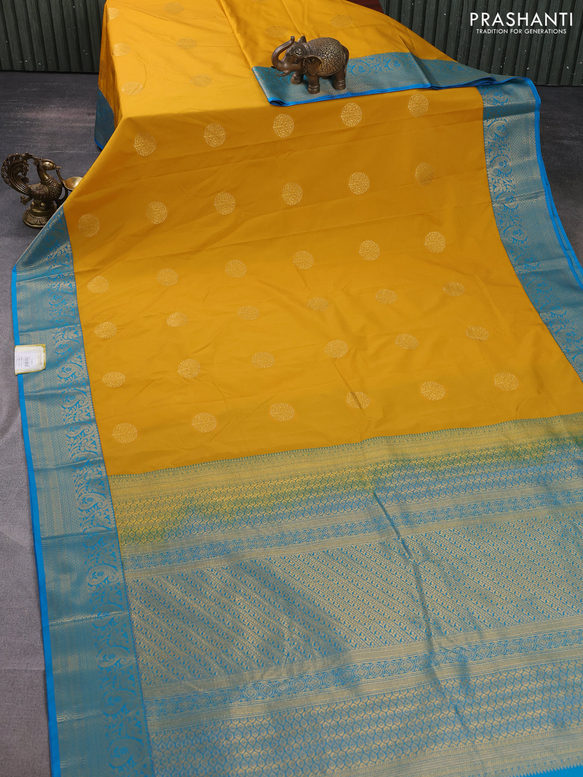 Semi kanchipuram silk saree mustard yellow and cs blue with zari woven buttas and zari woven korvai border