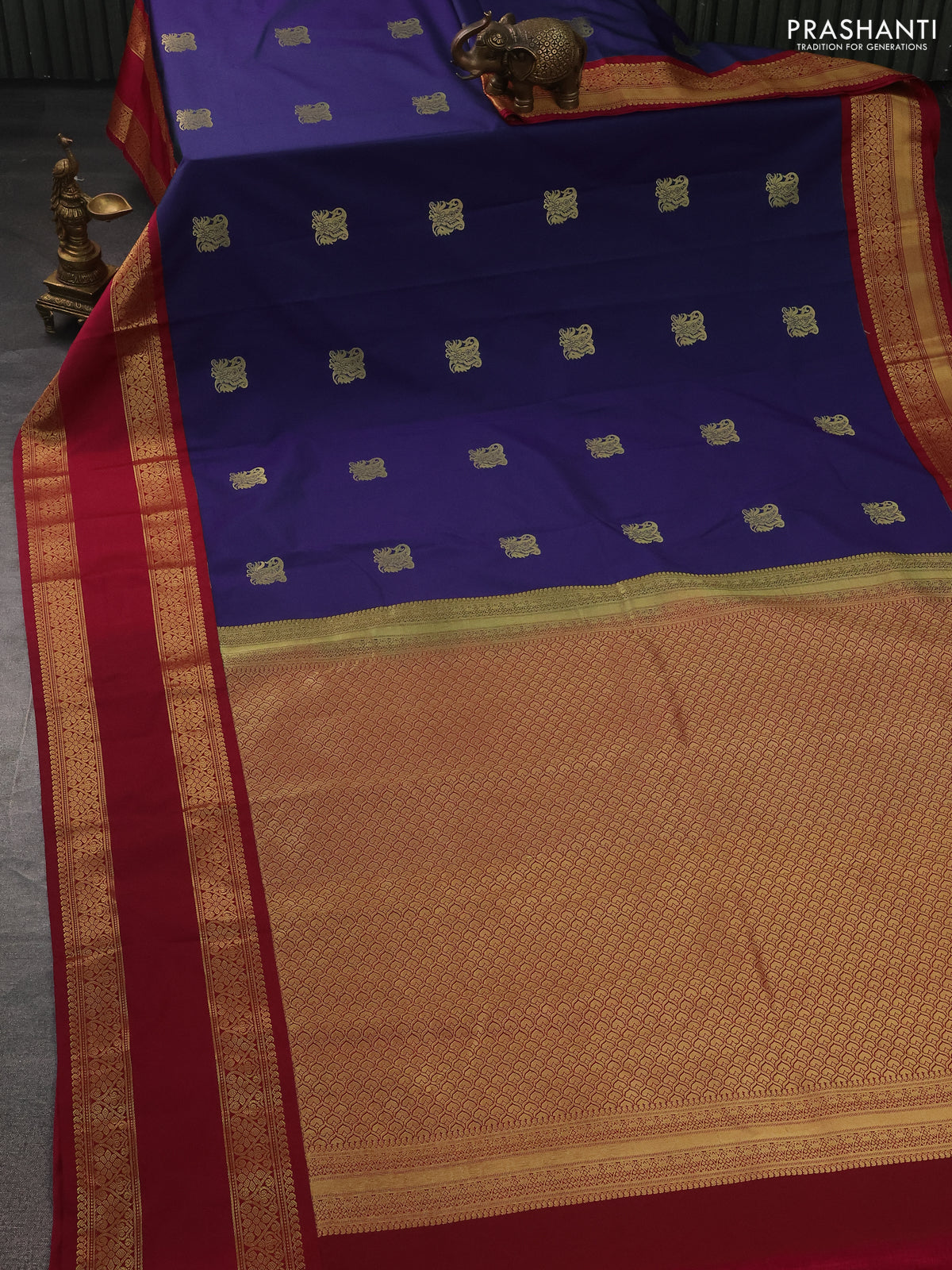 Semi kanchipuram silk saree navy blue and magenta pink with zari woven buttas and rettapet zari woven korvai border