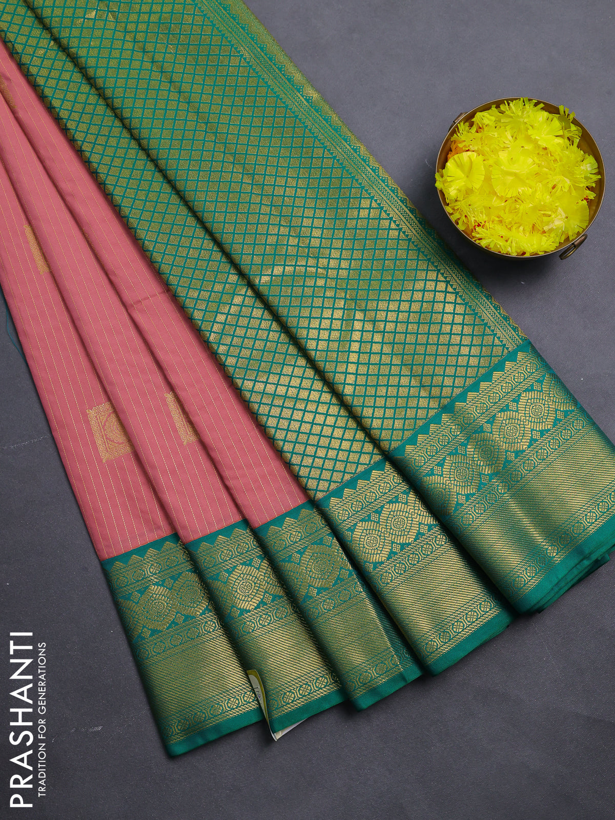 Semi kanchipuram silk saree peach pink and green with allover zari weaves & buttas and zari woven korvai border