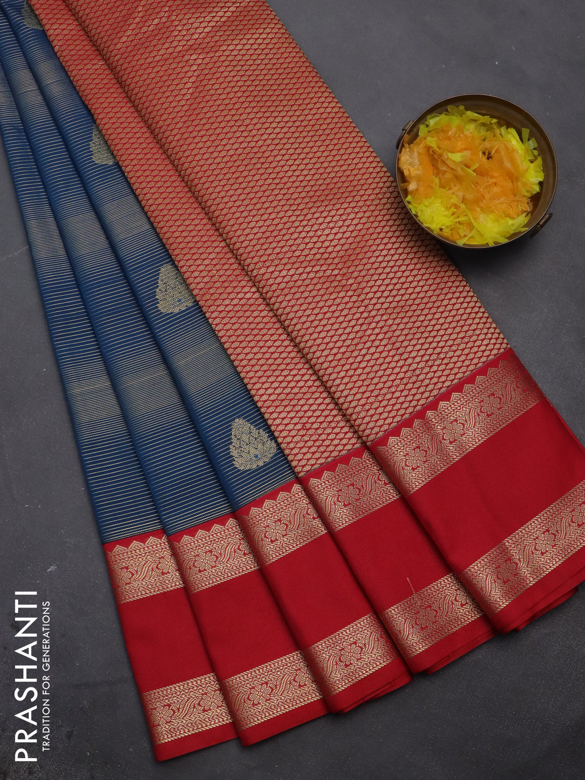 Semi kanchipuram silk saree peacock blue and red with allover zari weaves & buttas and rettapet zari woven korvai border