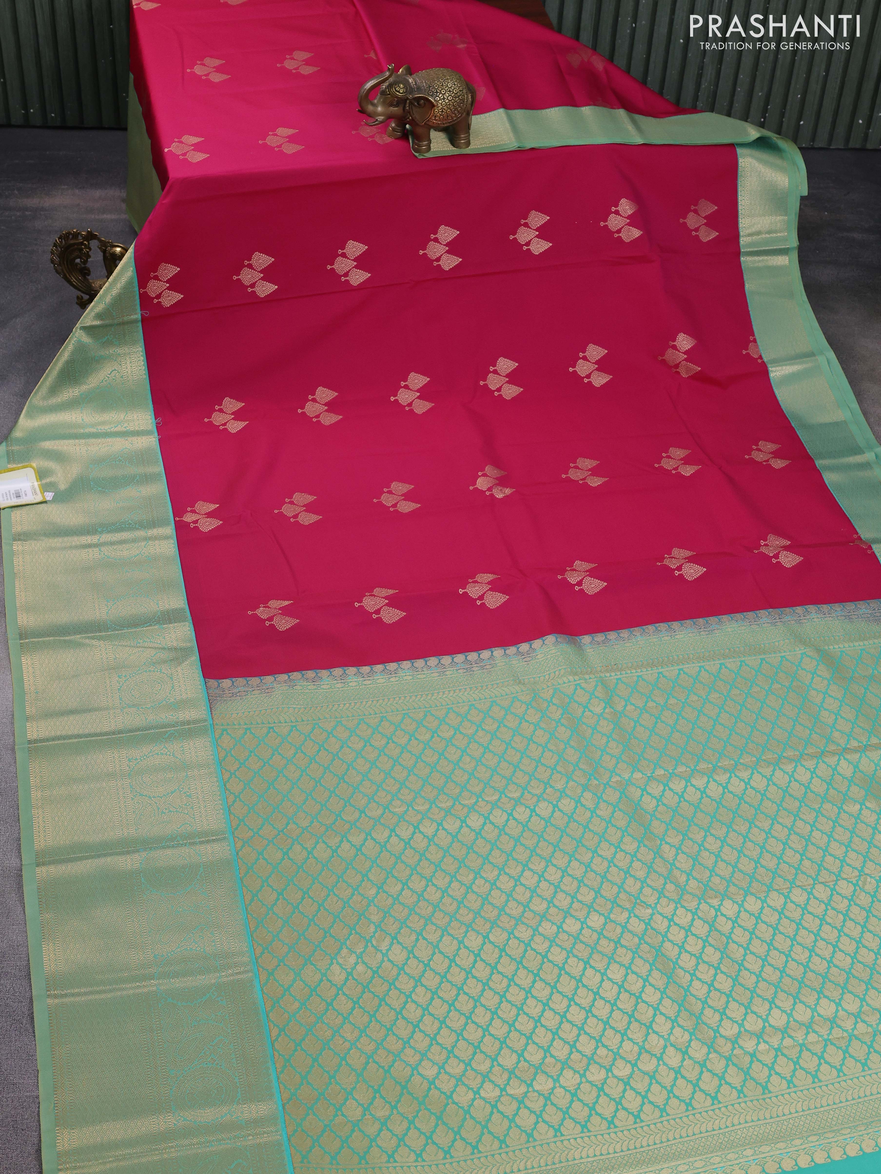 Semi kanchipuram silk saree pink and teal green shade with zari woven buttas and long zari woven korvai border