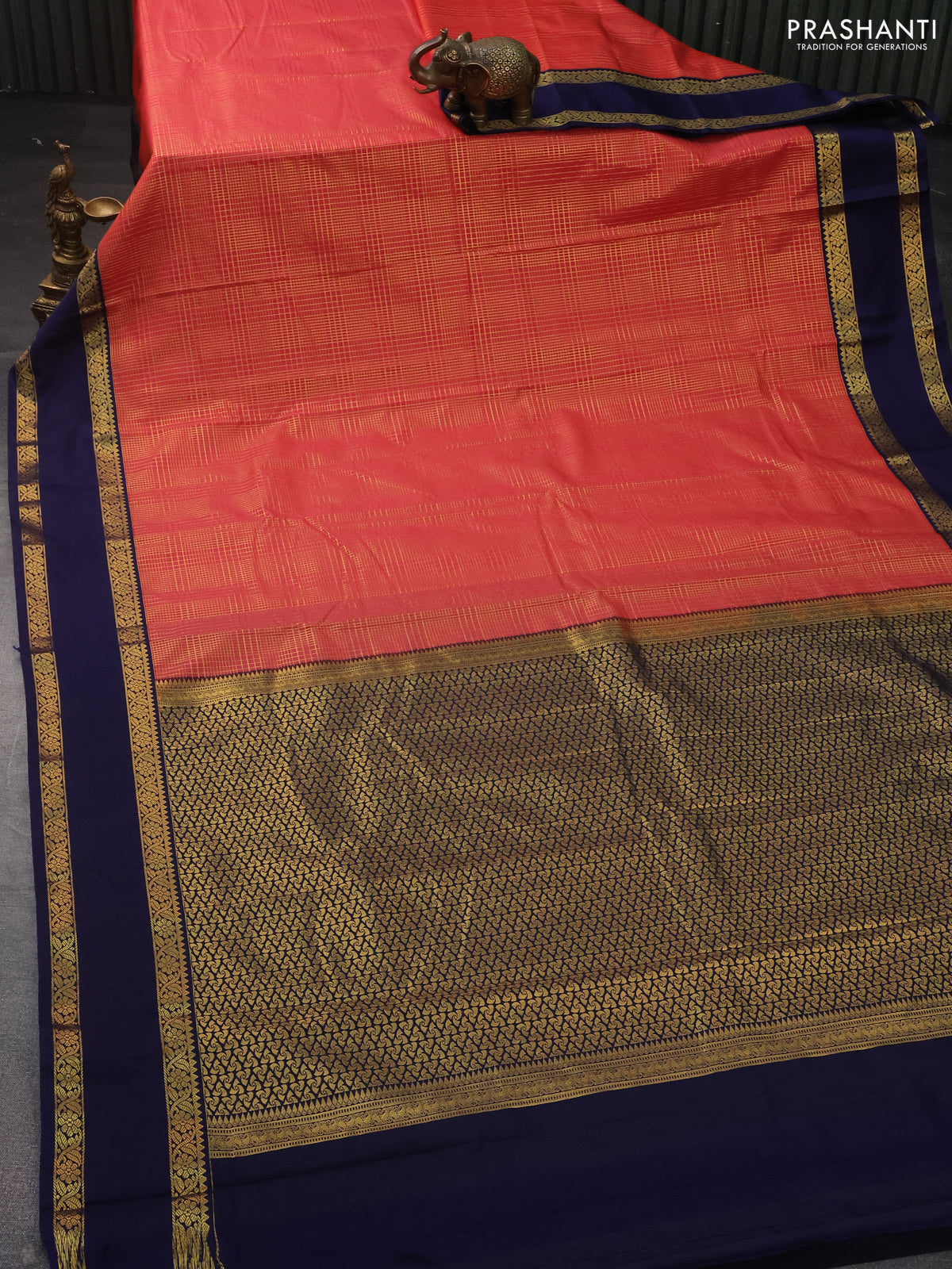 Semi kanchipuram silk saree pink shade and navy blue with allover small zari checks and rettapet zari woven korvai border
