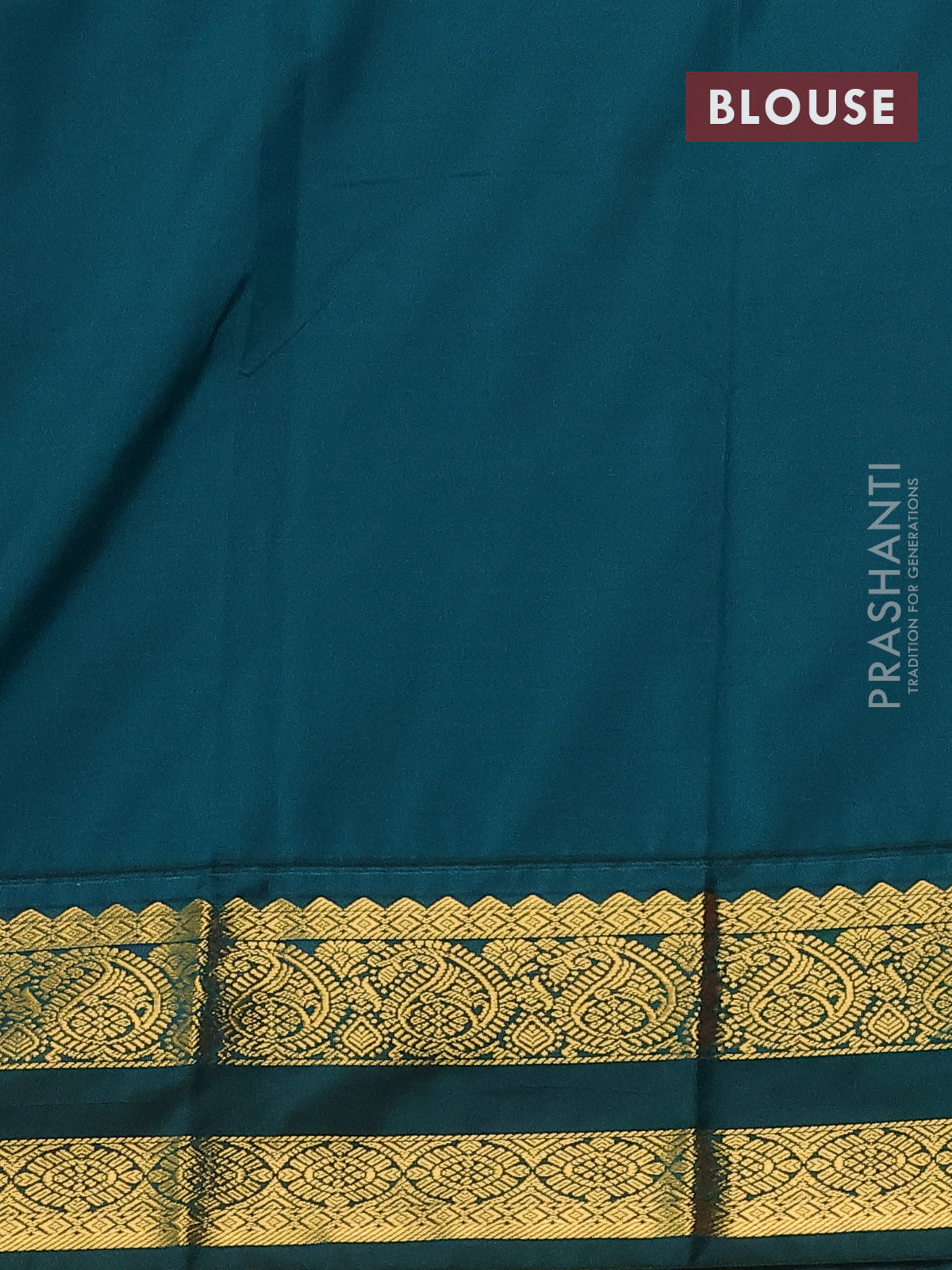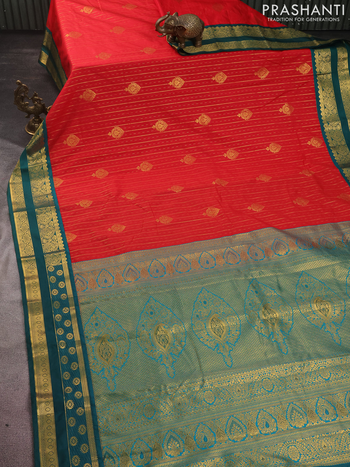 Semi kanchipuram silk saree red and teal green with allover zari weaves & buttas and rettapet zari woven korvai border
