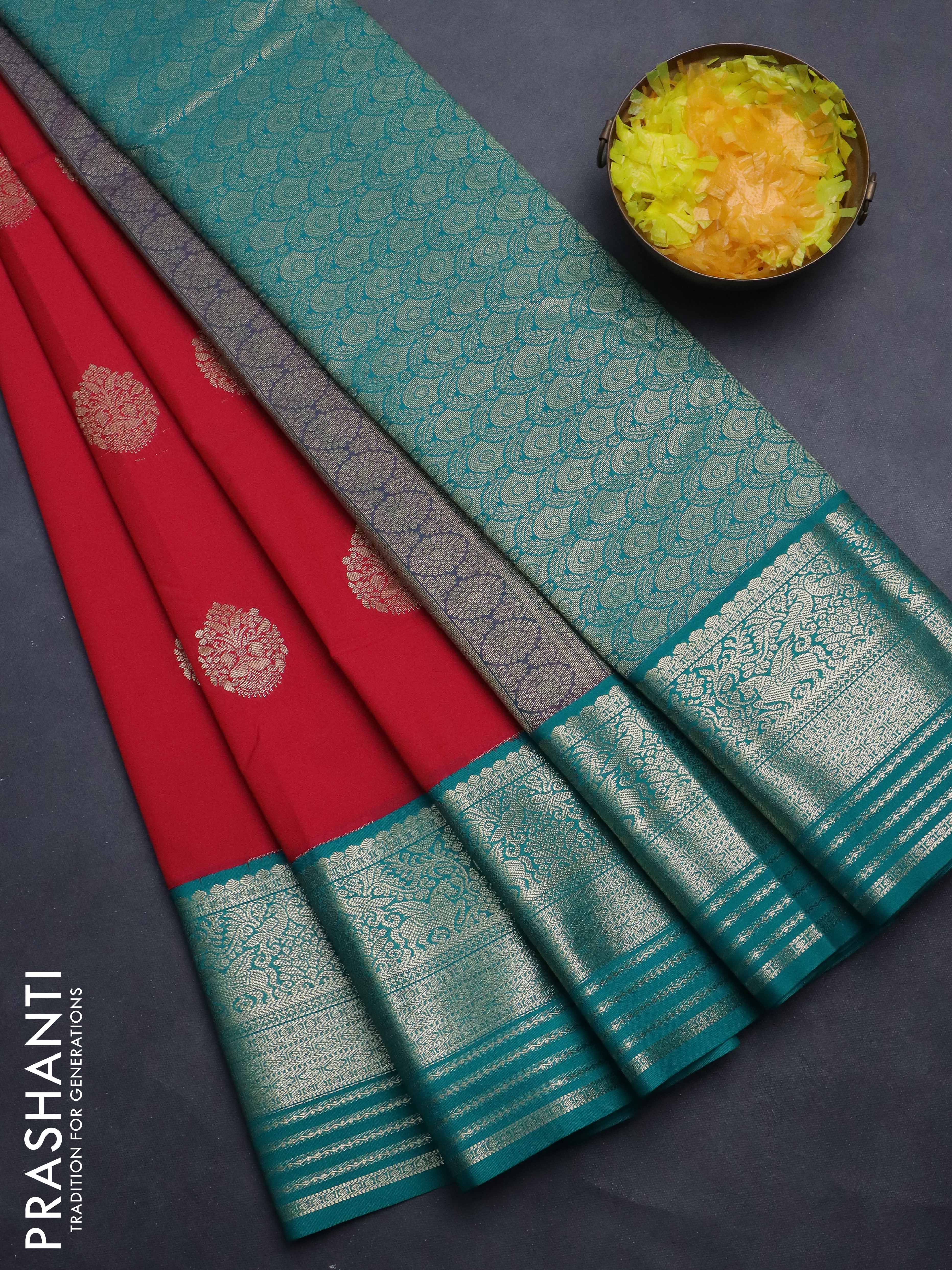 Semi kanchipuram silk saree red and teal green with zari woven buttas and long zari woven korvai border