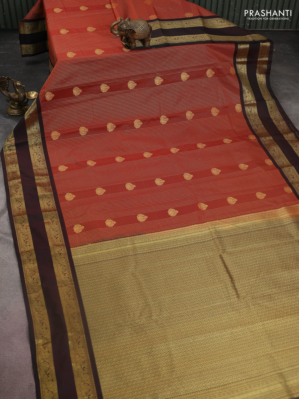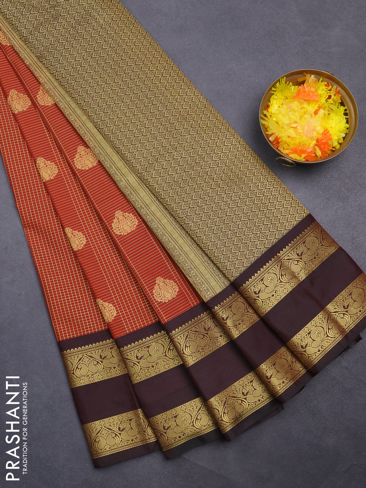 Semi kanchipuram silk saree rust shade and deep maroon with allover small zari checks & buttas and rettapet zari woven korvai border