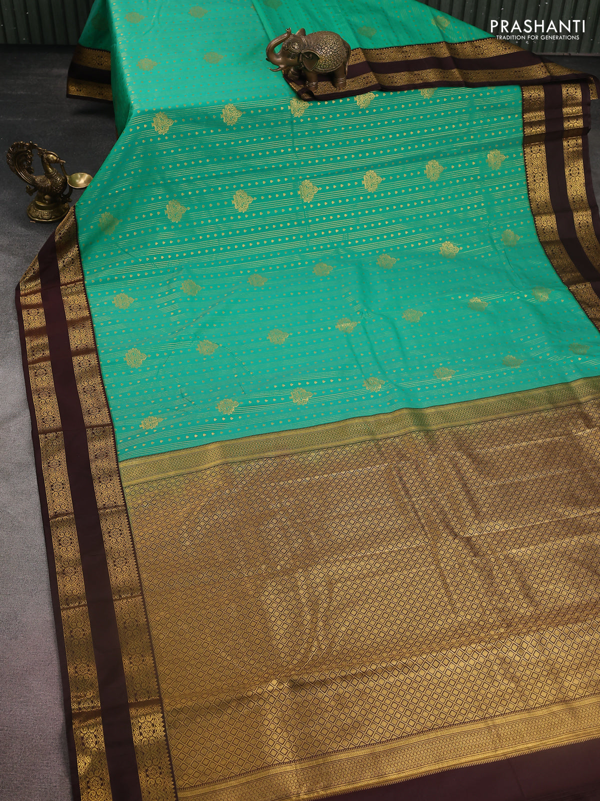 Semi kanchipuram silk saree teal green and brown with allover zari weaves & buttas and rettapet zari woven korvai border
