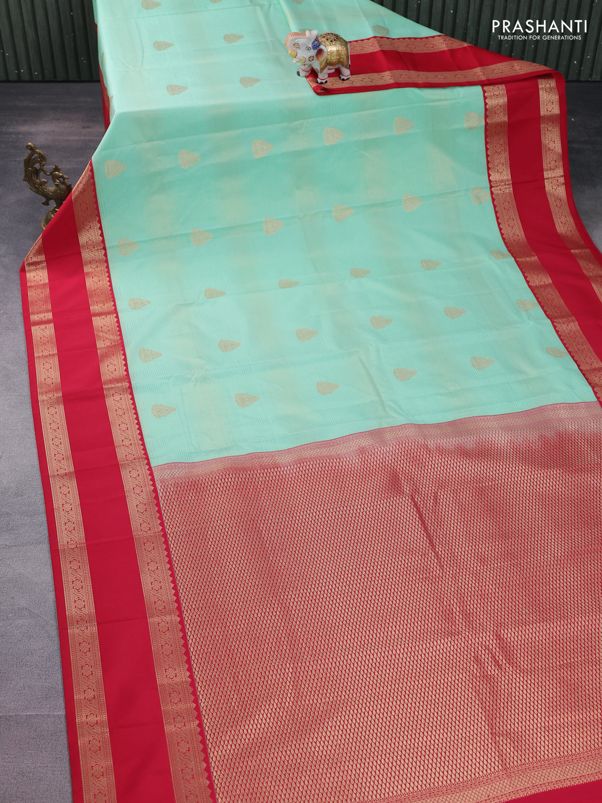Semi kanchipuram silk saree teal green shade and red with allover zari weaves & buttas and rettapet zari woven korvai border
