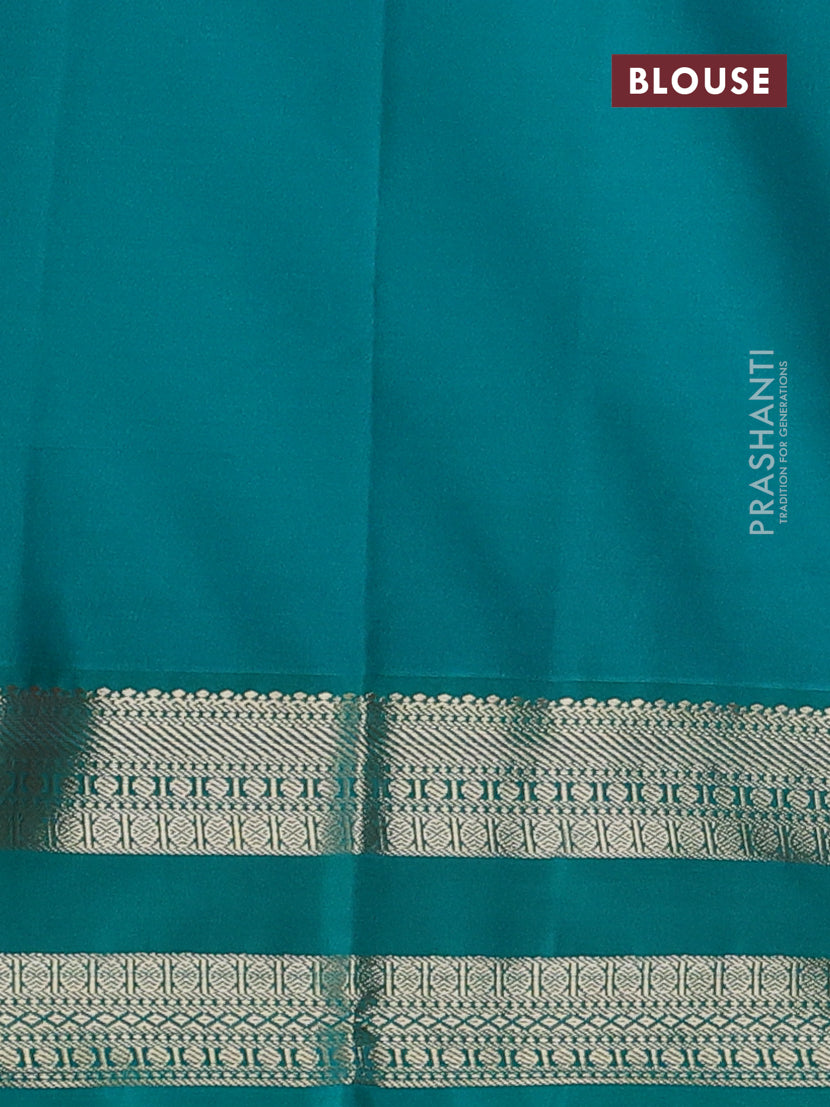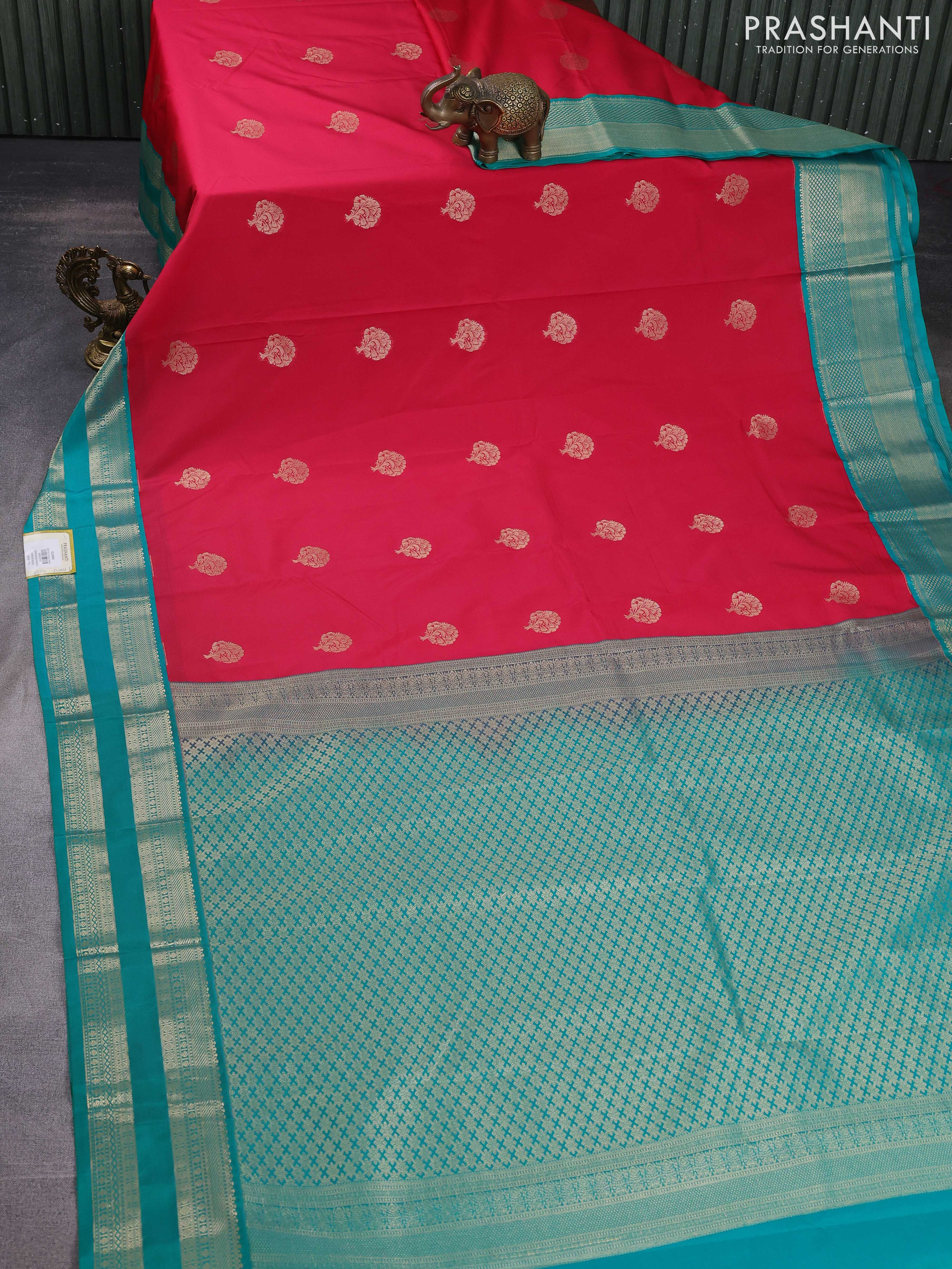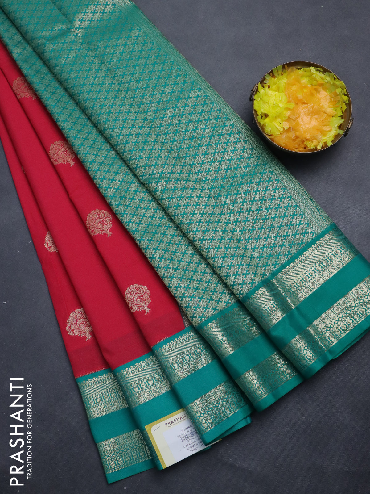 Semi kanchipuram silk saree tomato pink and teal green with zari woven buttas and rettapet zari woven korvai border
