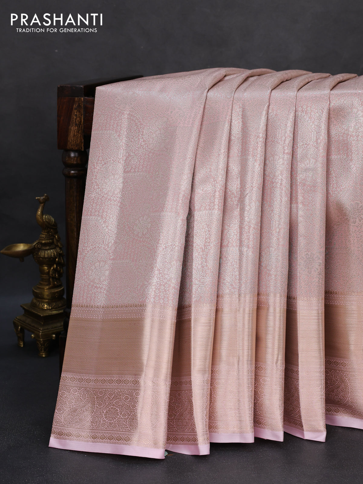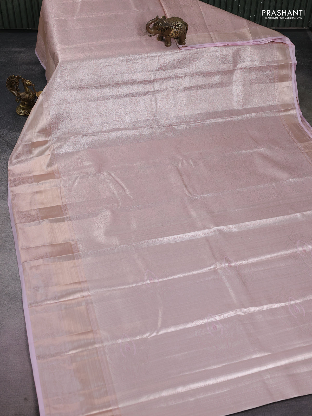 Semi kanchipuram tissue silk saree baby pink with allover silver zari woven brocade weaves and long zari woven border