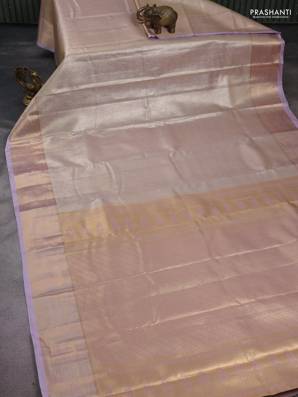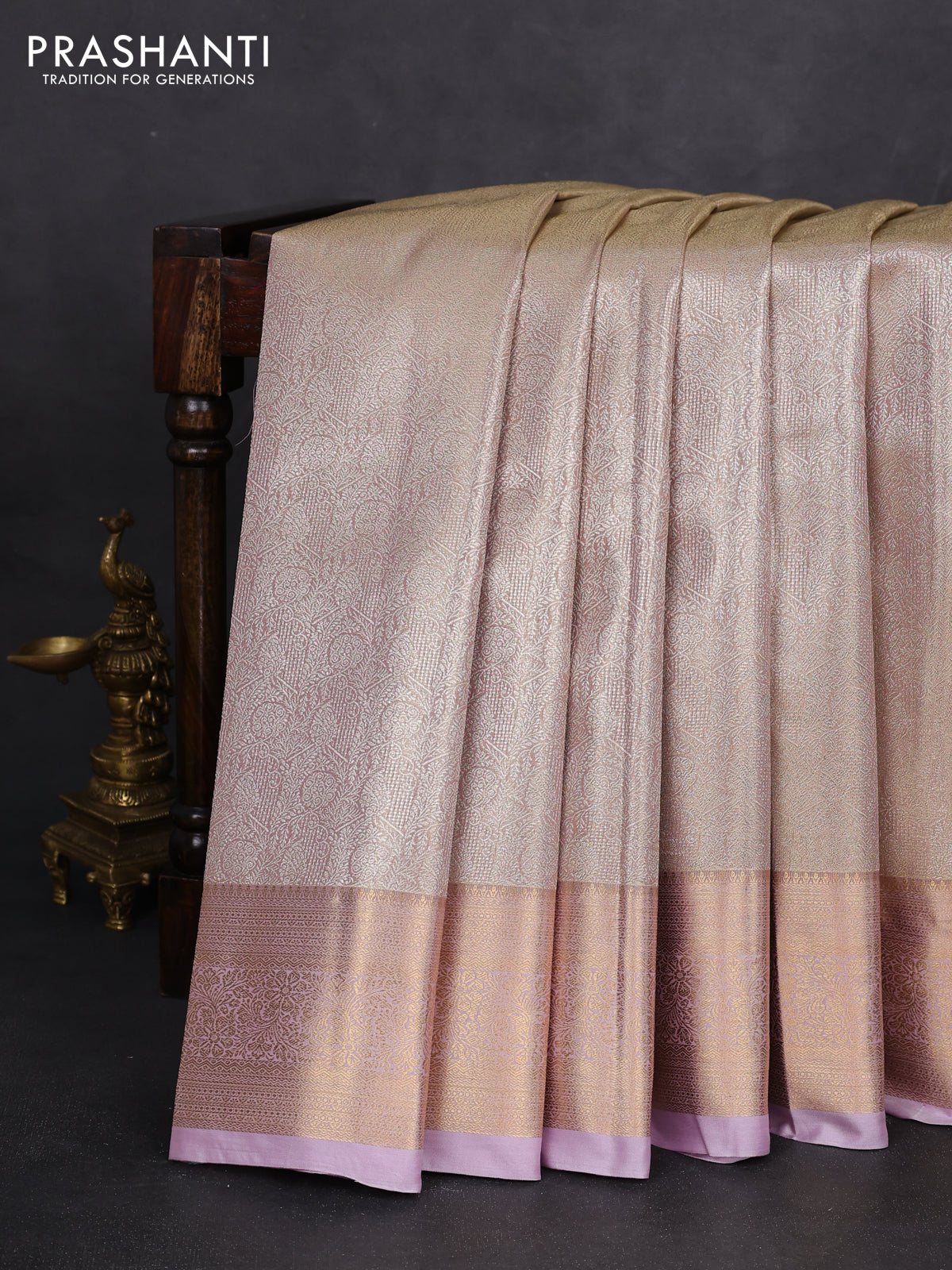 Semi kanchipuram tissue silk saree beige and lavender with allover silver zari woven brocade weaves and rich zari woven border