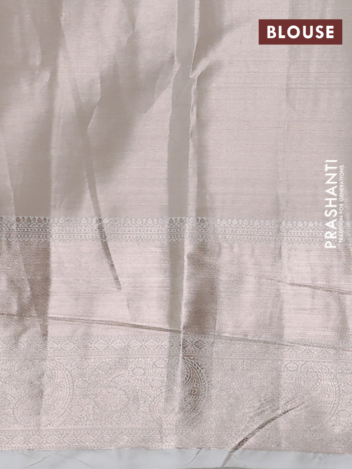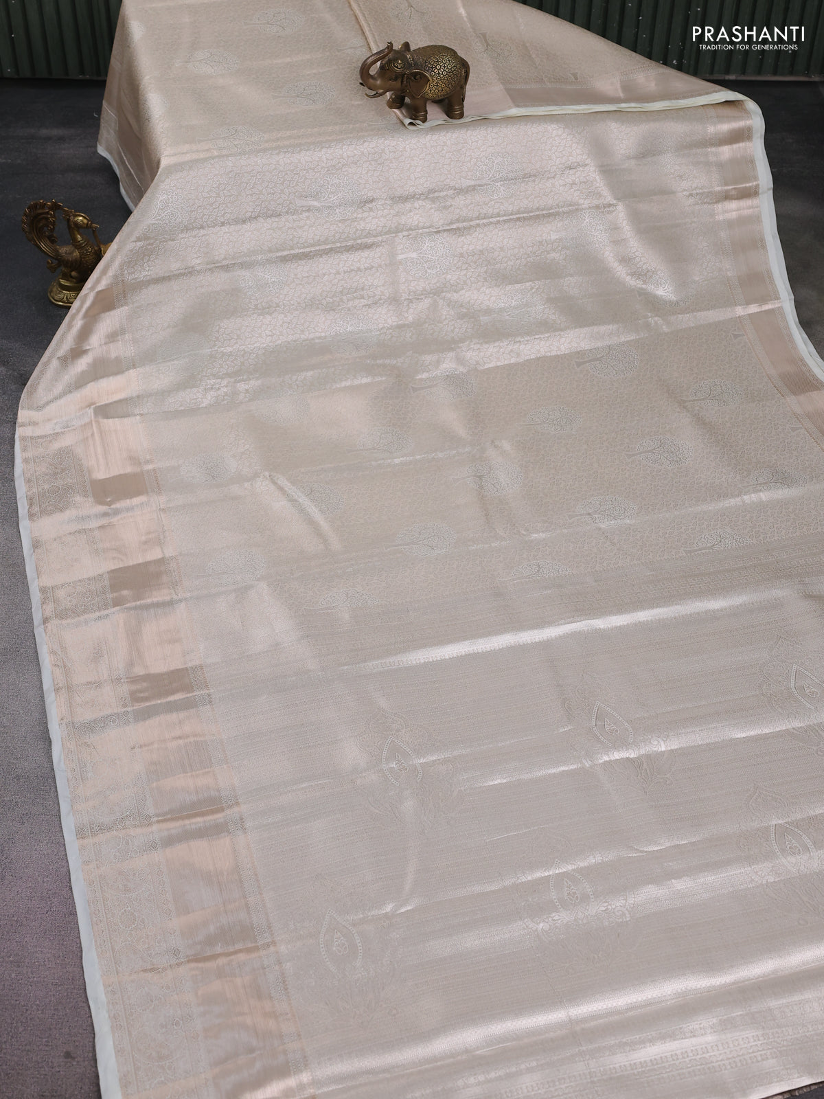 Semi kanchipuram tissue silk saree cream with allover silver zari woven brocade weaves and long zari woven border