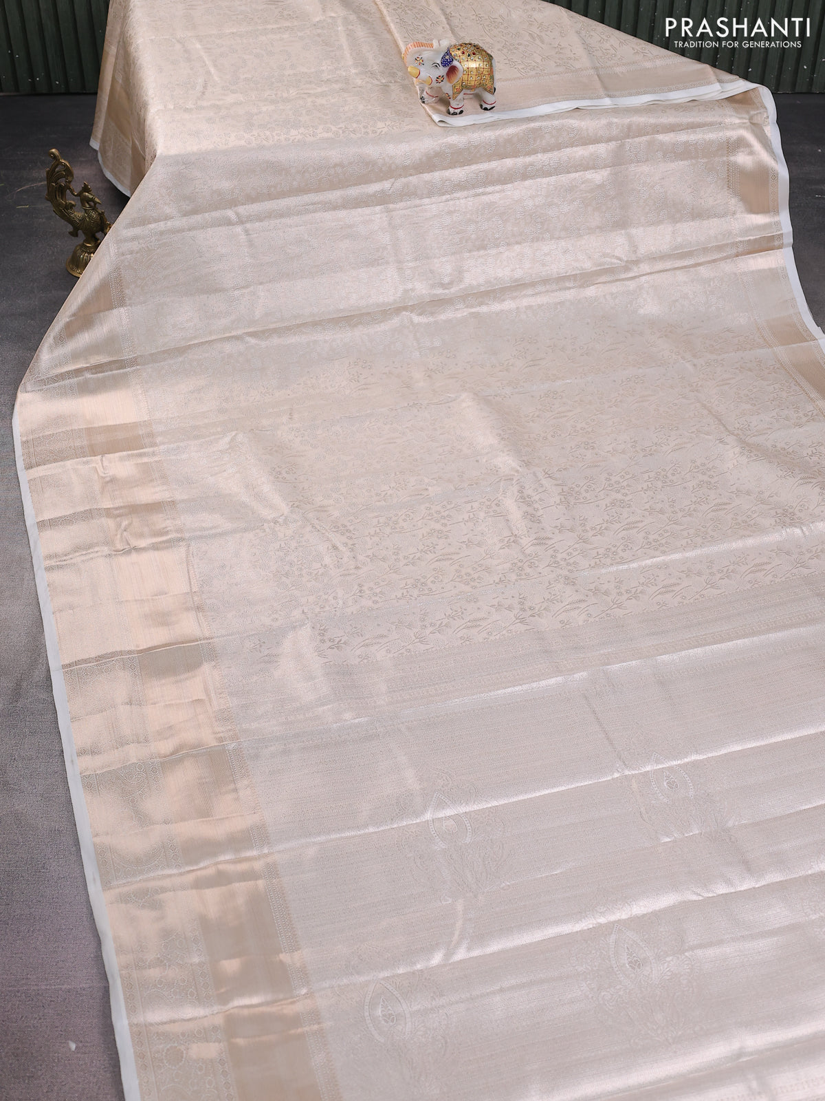 Semi kanchipuram tissue silk saree cream with allover silver zari woven brocade weaves and long zari woven border