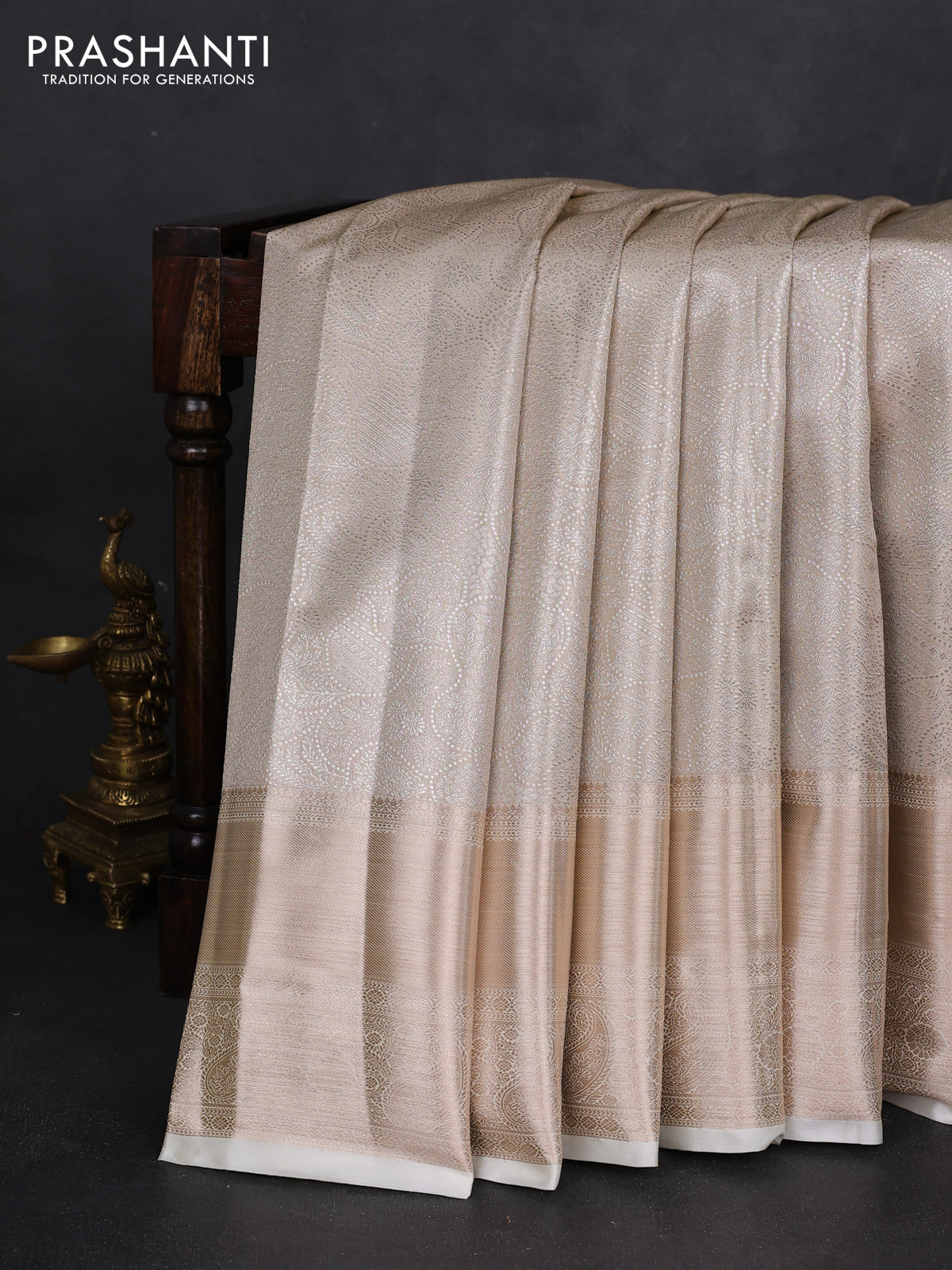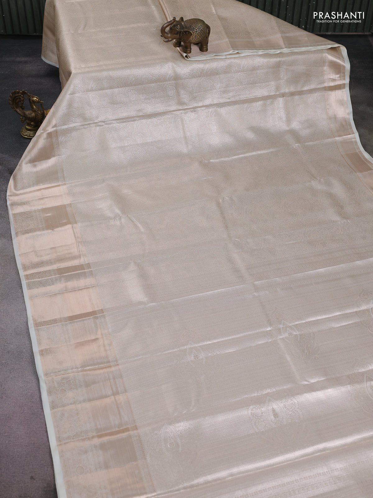 Semi kanchipuram tissue silk saree cream with allover silver zari woven brocade weaves and long zari woven border