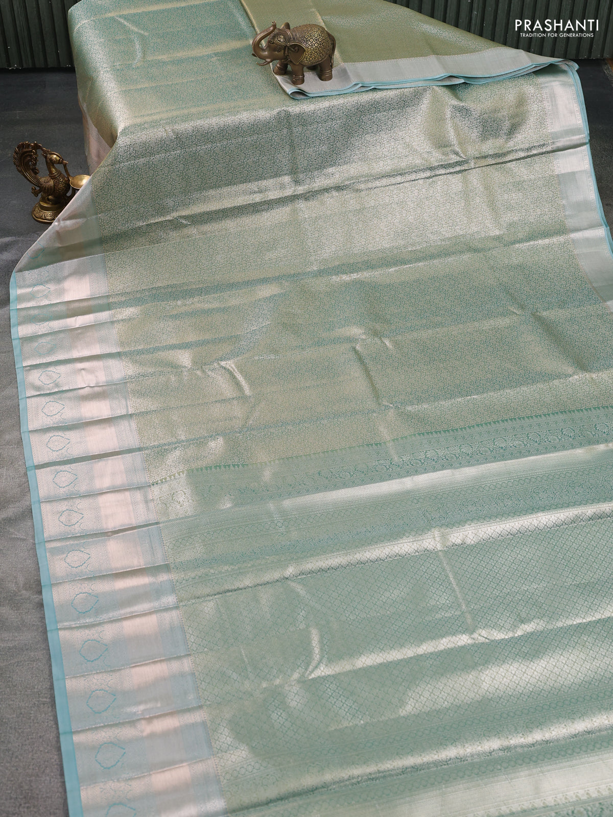 Semi kanchipuram tissue silk saree dual shade of green and teal with allover silver zari woven brocade weaves and long zari woven border