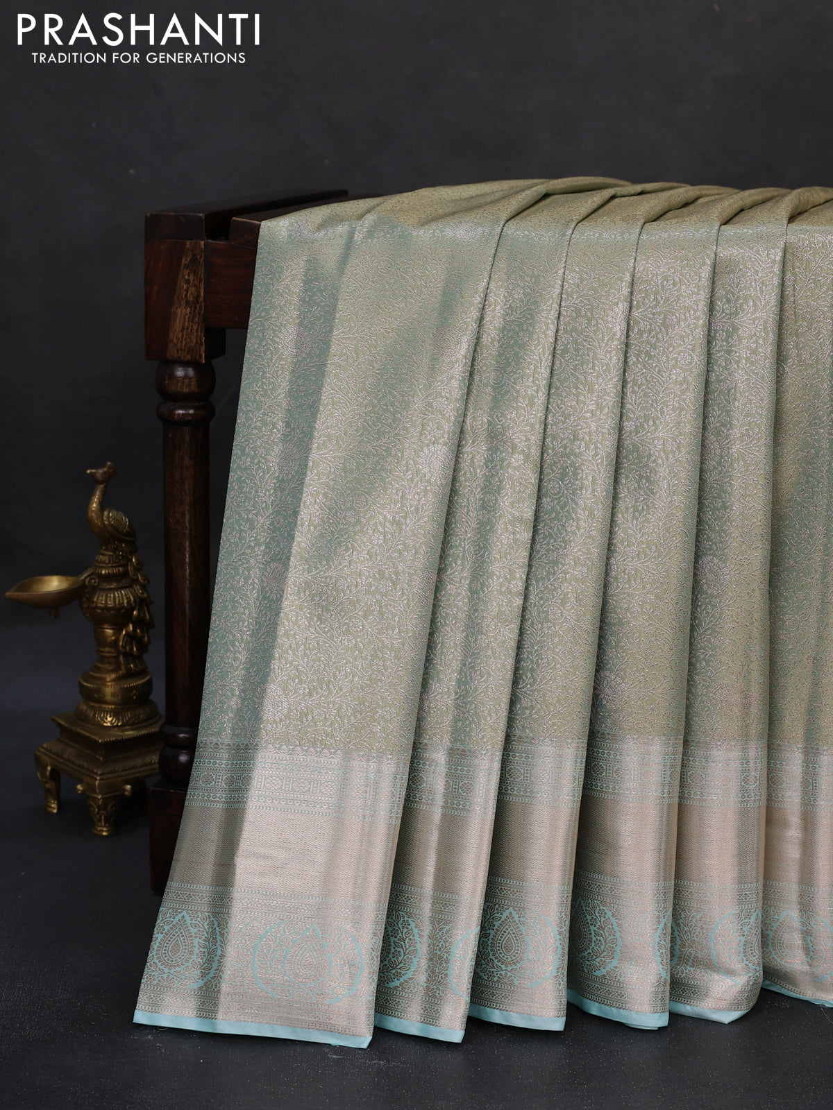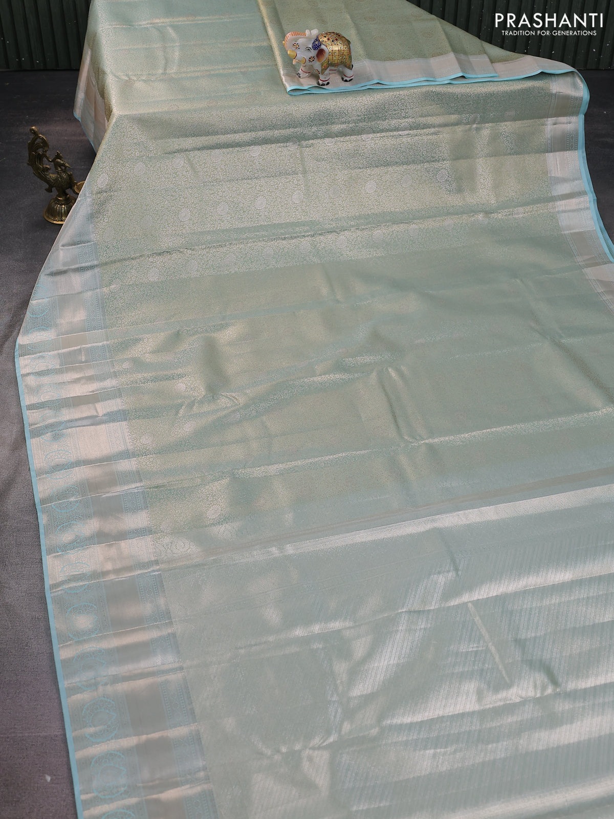 Semi kanchipuram tissue silk saree dual shade of pastel blue with allover silver zari woven brocade weaves and zari woven border