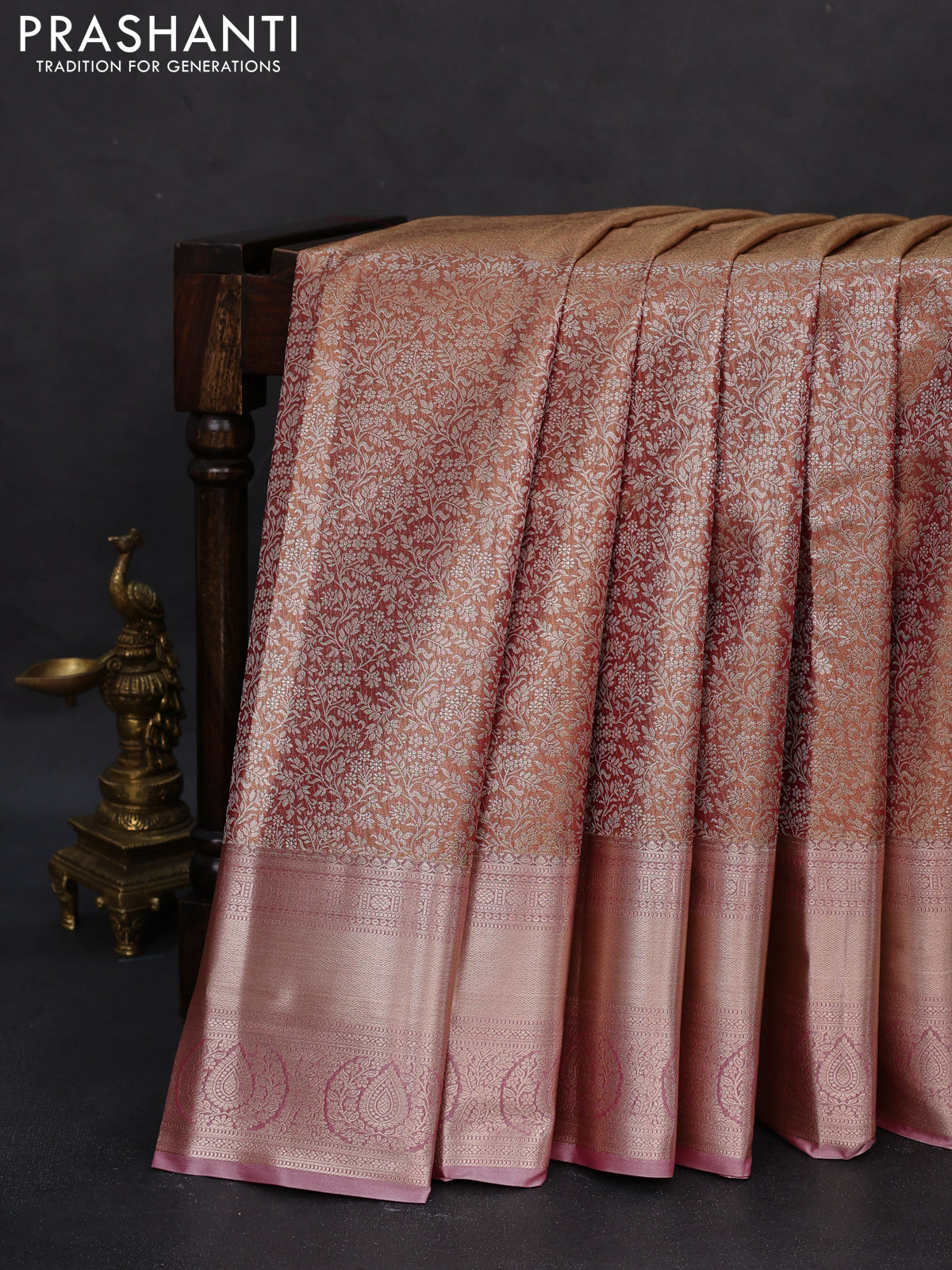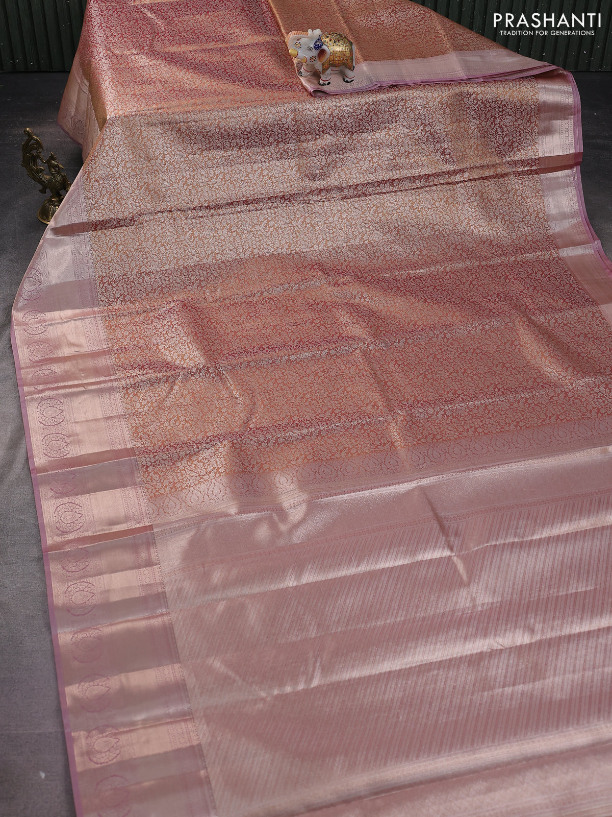 Semi kanchipuram tissue silk saree dual shade of pink and pastel pink with allover silver zari woven brocade weaves and zari woven border