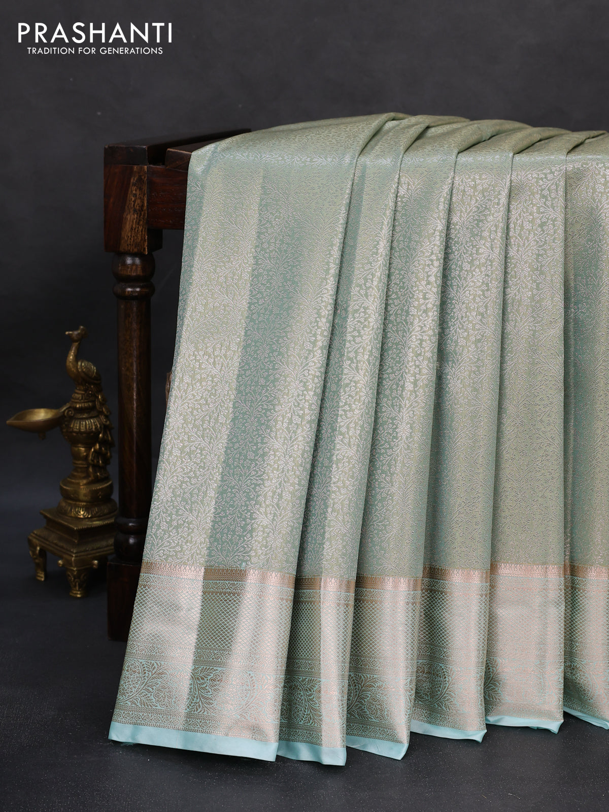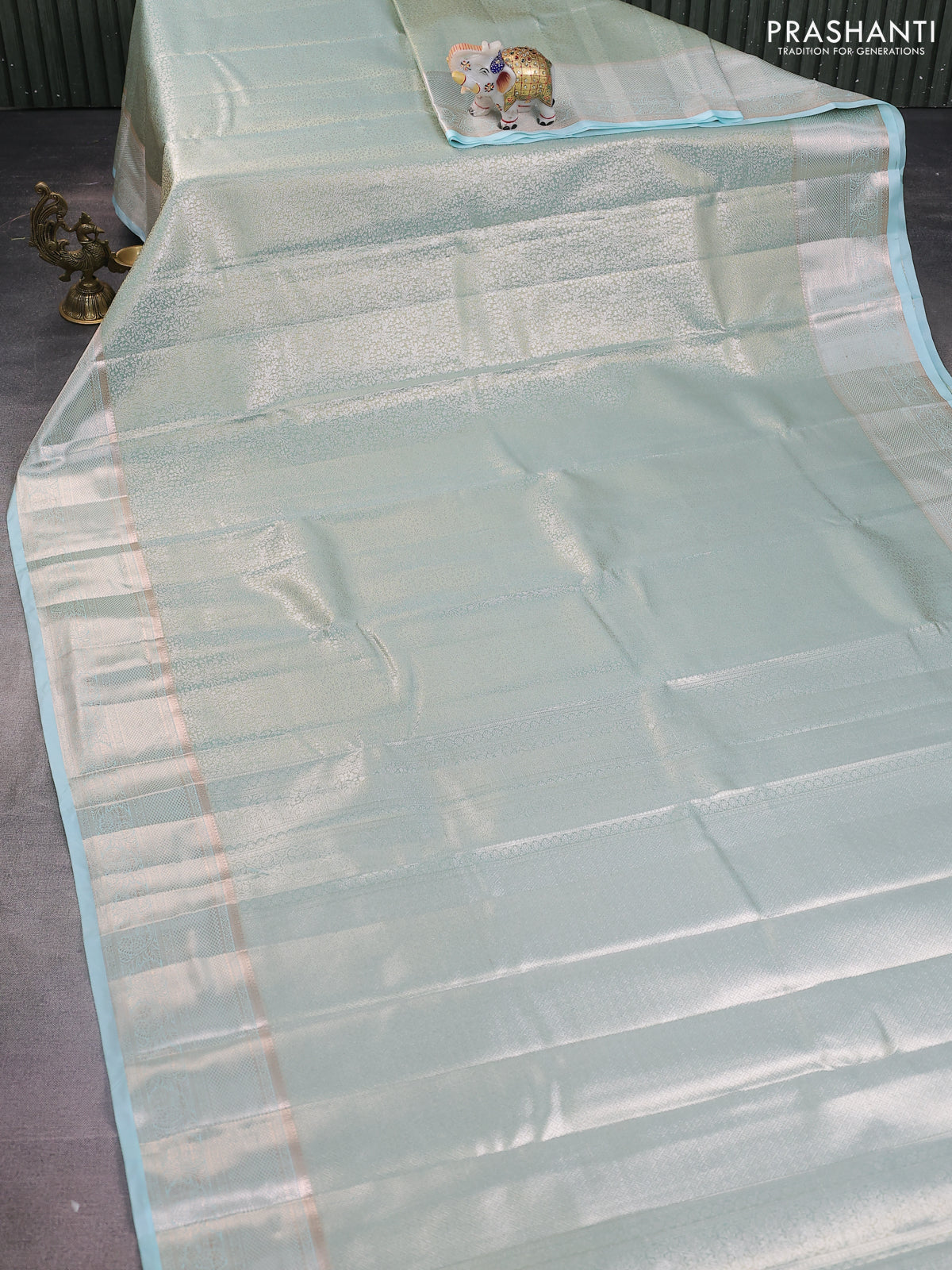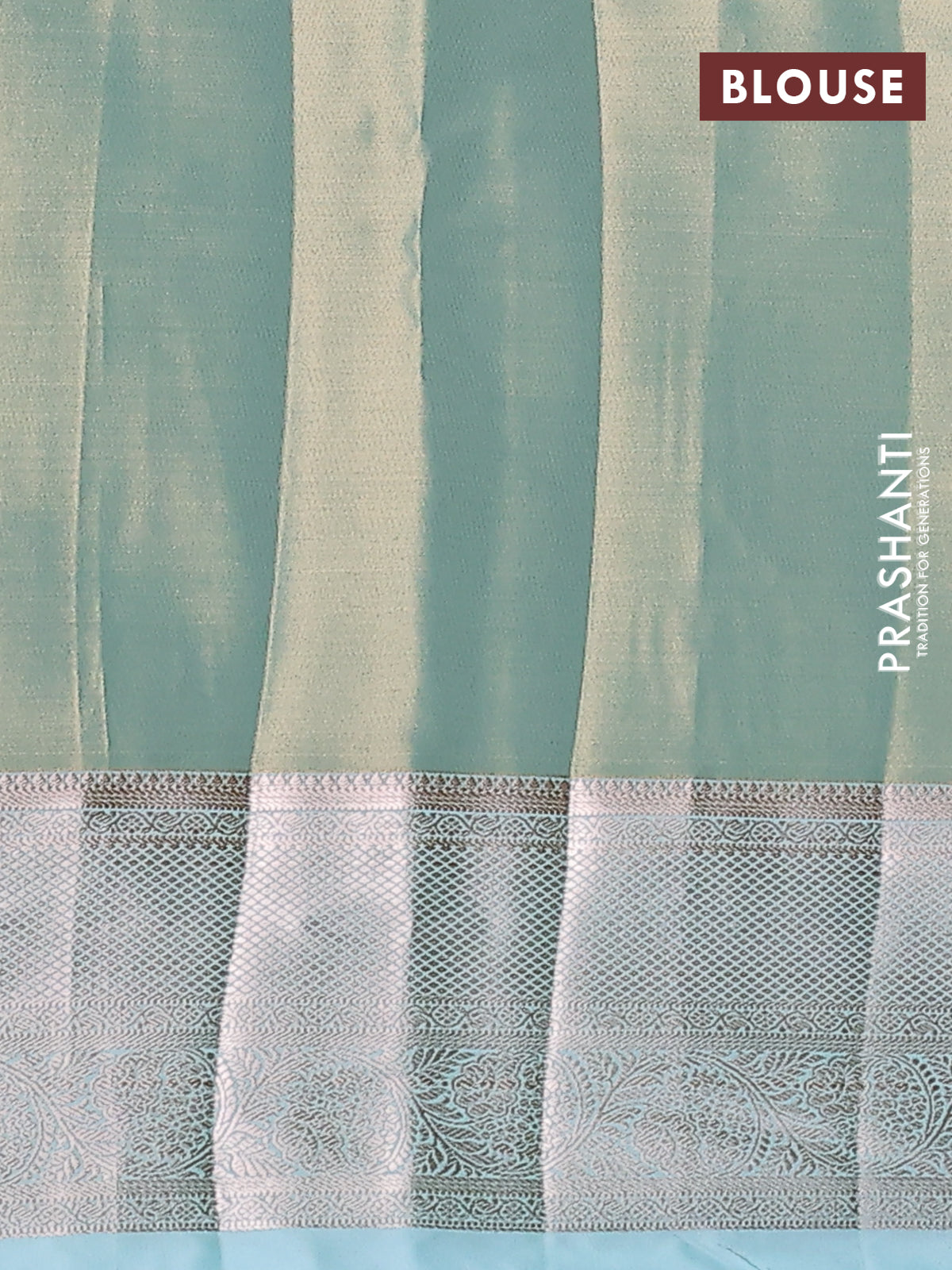 Semi kanchipuram tissue silk saree dual shade of teal with allover silver zari woven brocade weaves and zari woven border