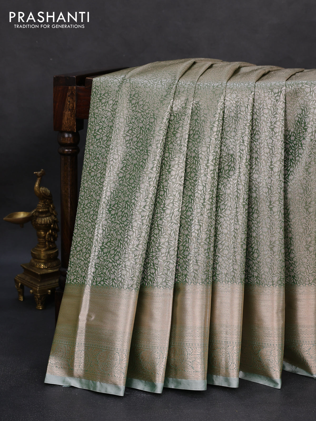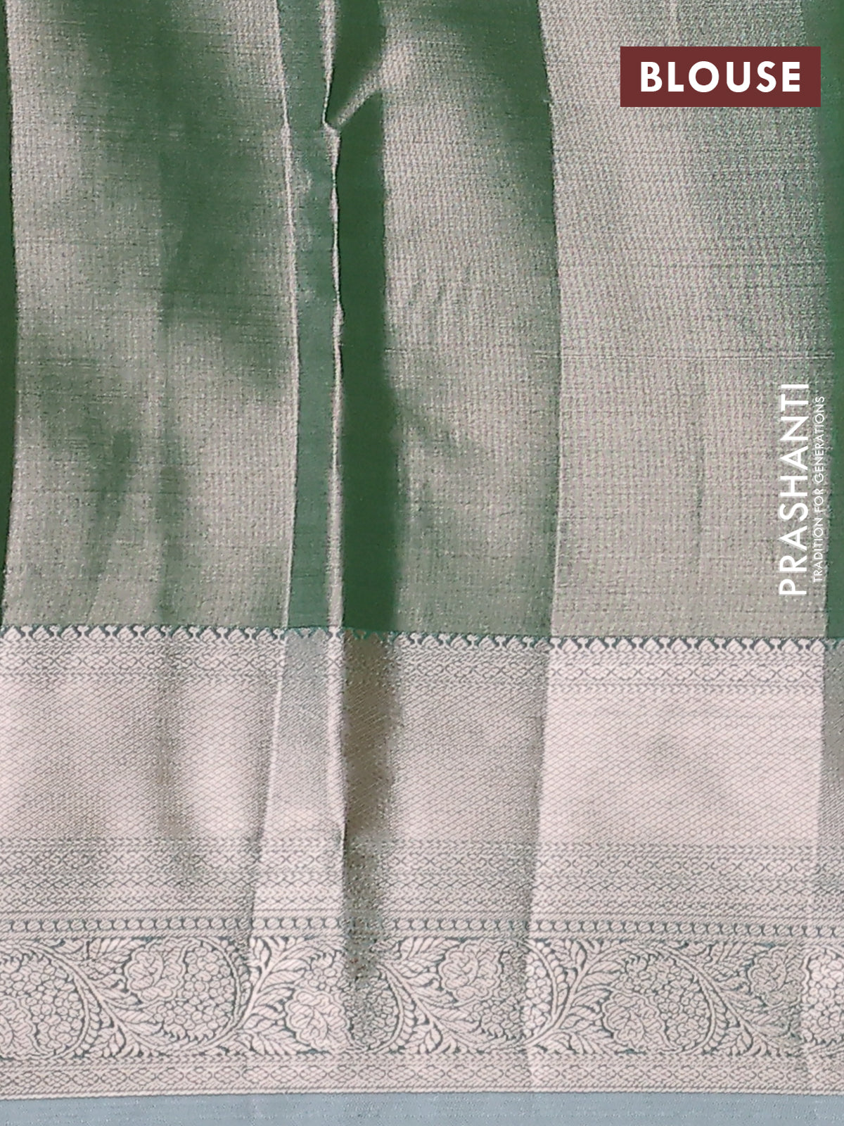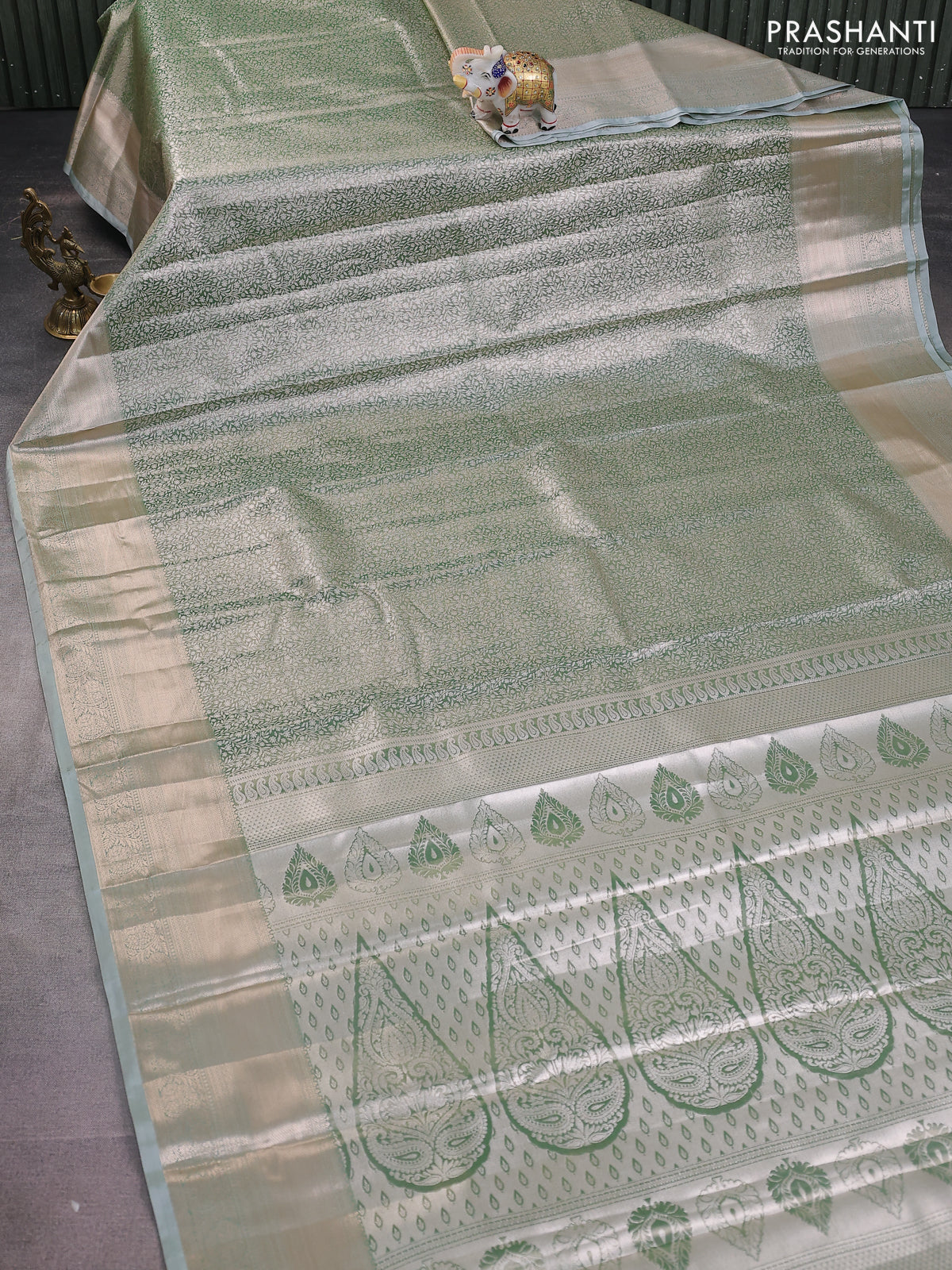 Semi kanchipuram tissue silk saree green shade with allover silver zari woven brocade weaves and zari woven border