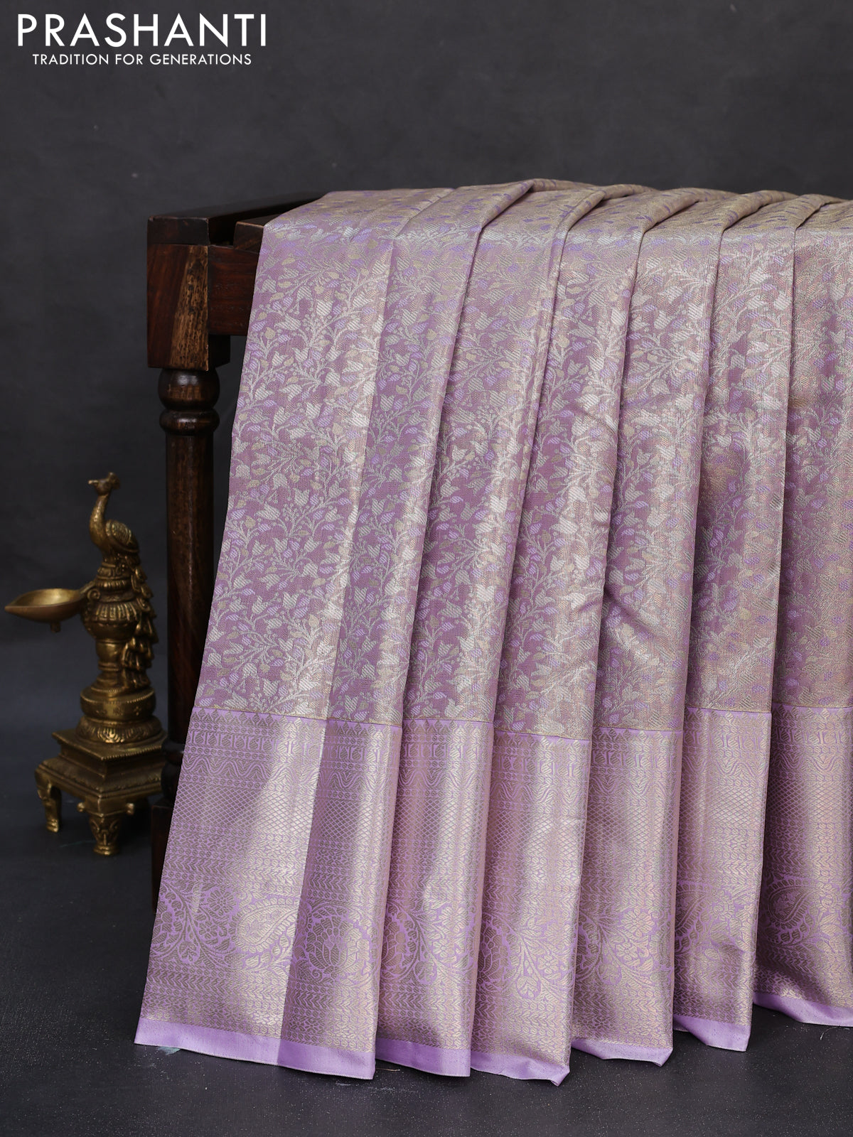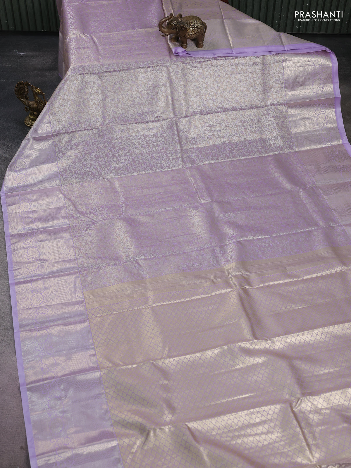 Semi kanchipuram tissue silk saree lavender with allover silver zari woven brocade weaves and long zari woven border
