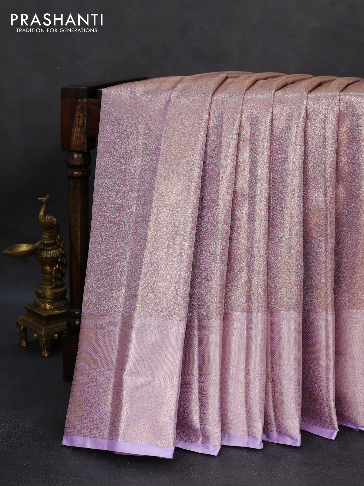 Semi kanchipuram tissue silk saree lavender with allover silver zari woven brocade weaves and long zari woven border