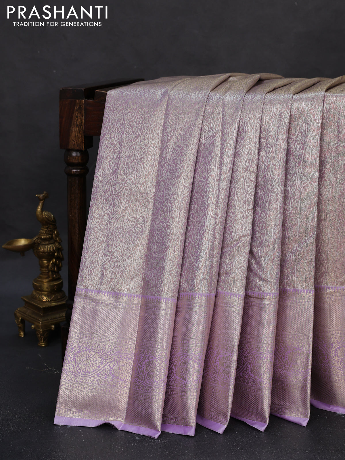 Semi kanchipuram tissue silk saree lavender with allover silver zari woven brocade weaves and zari woven border