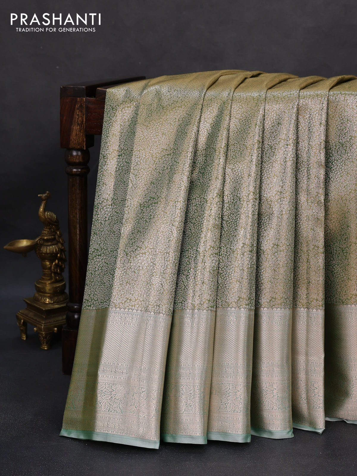 Semi kanchipuram tissue silk saree light green with allover silver zari woven brocade weaves and long zari woven border