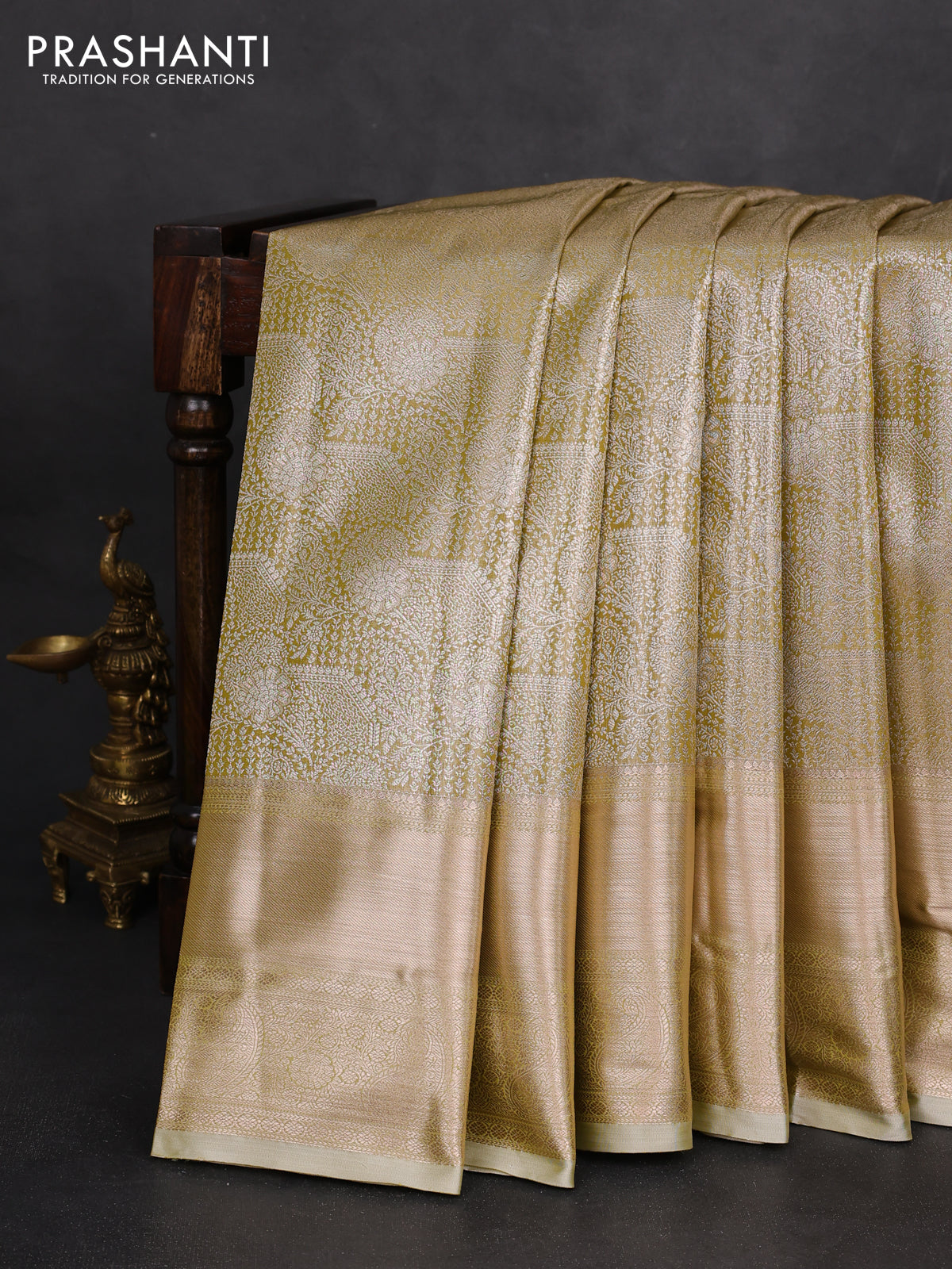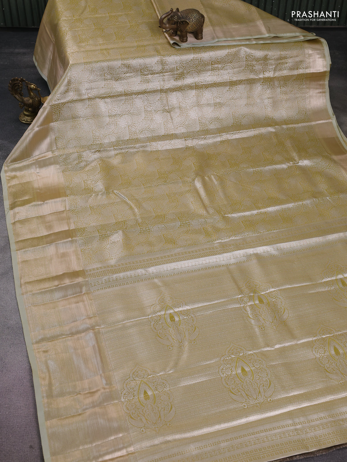 Semi kanchipuram tissue silk saree lime green shade and elaichi green with allover silver zari woven brocade weaves and long zari woven border