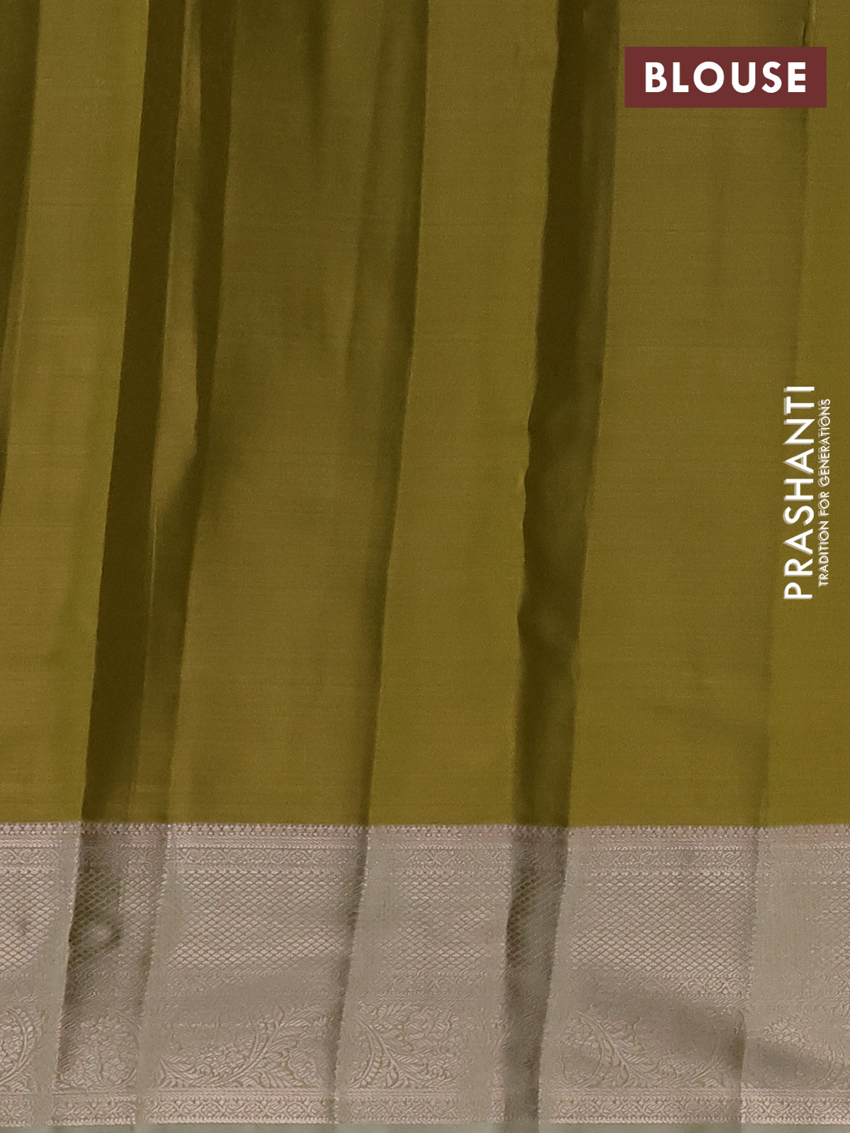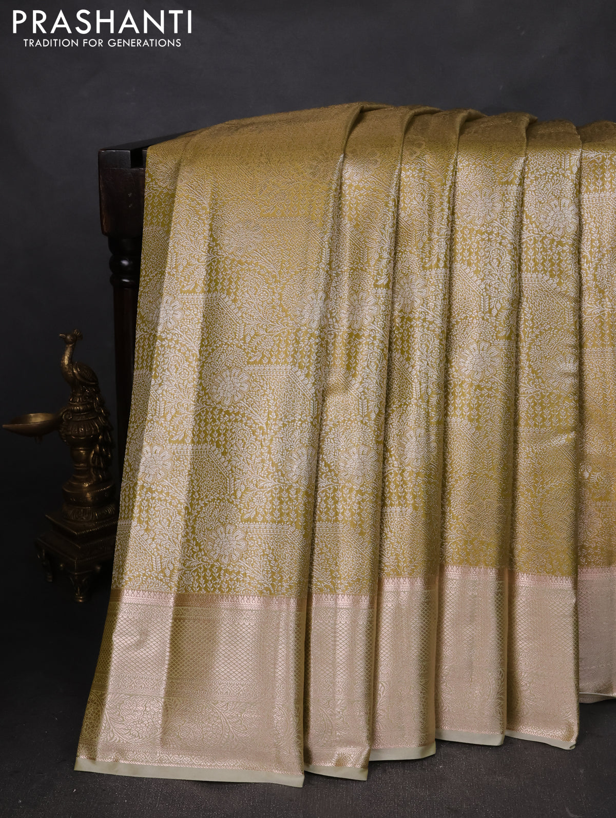Semi kanchipuram tissue silk saree lime green with allover silver zari woven brocade weaves and zari woven border