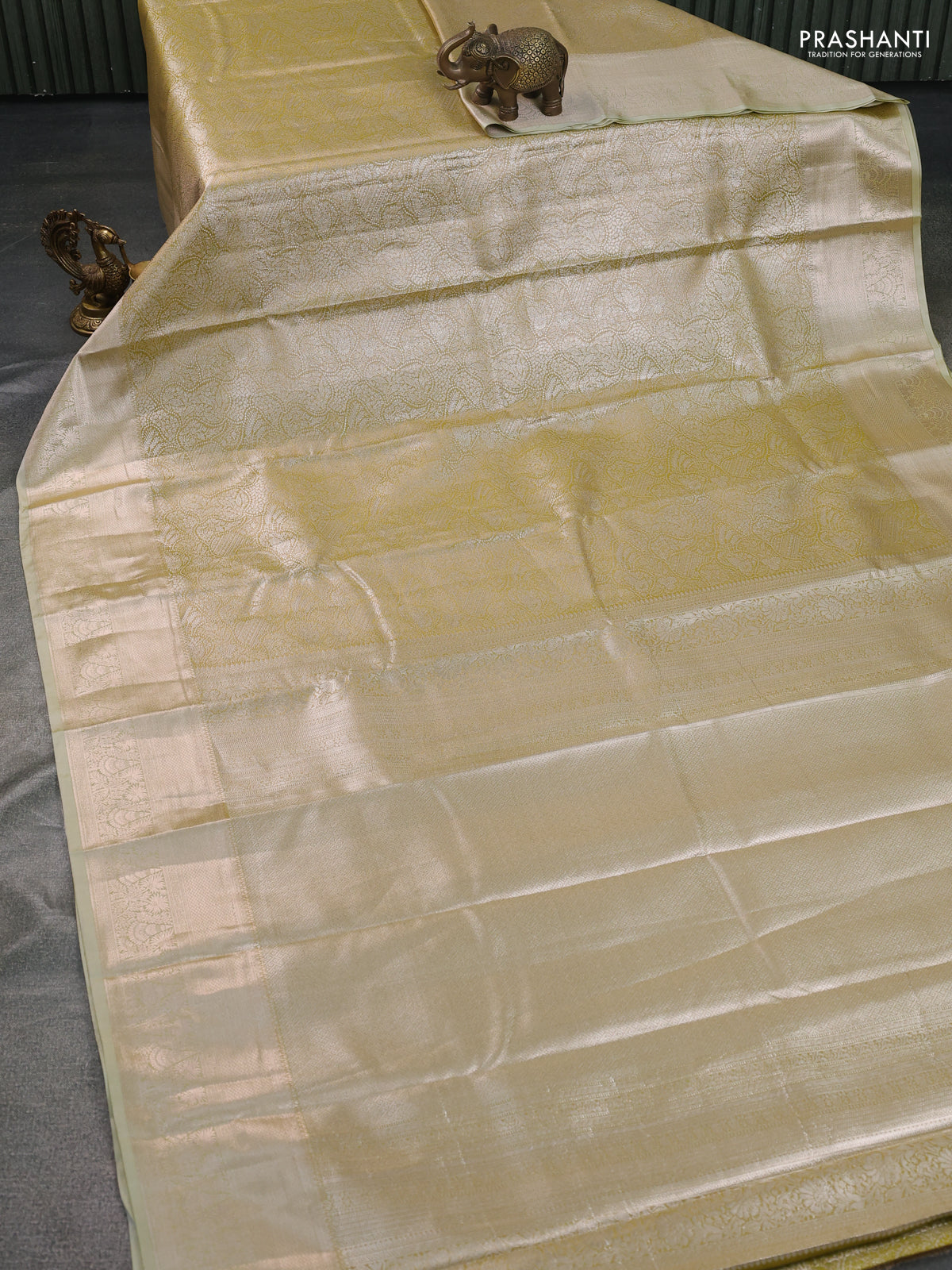 Semi kanchipuram tissue silk saree lime yellow with allover silver zari woven brocade weaves and zari woven border
