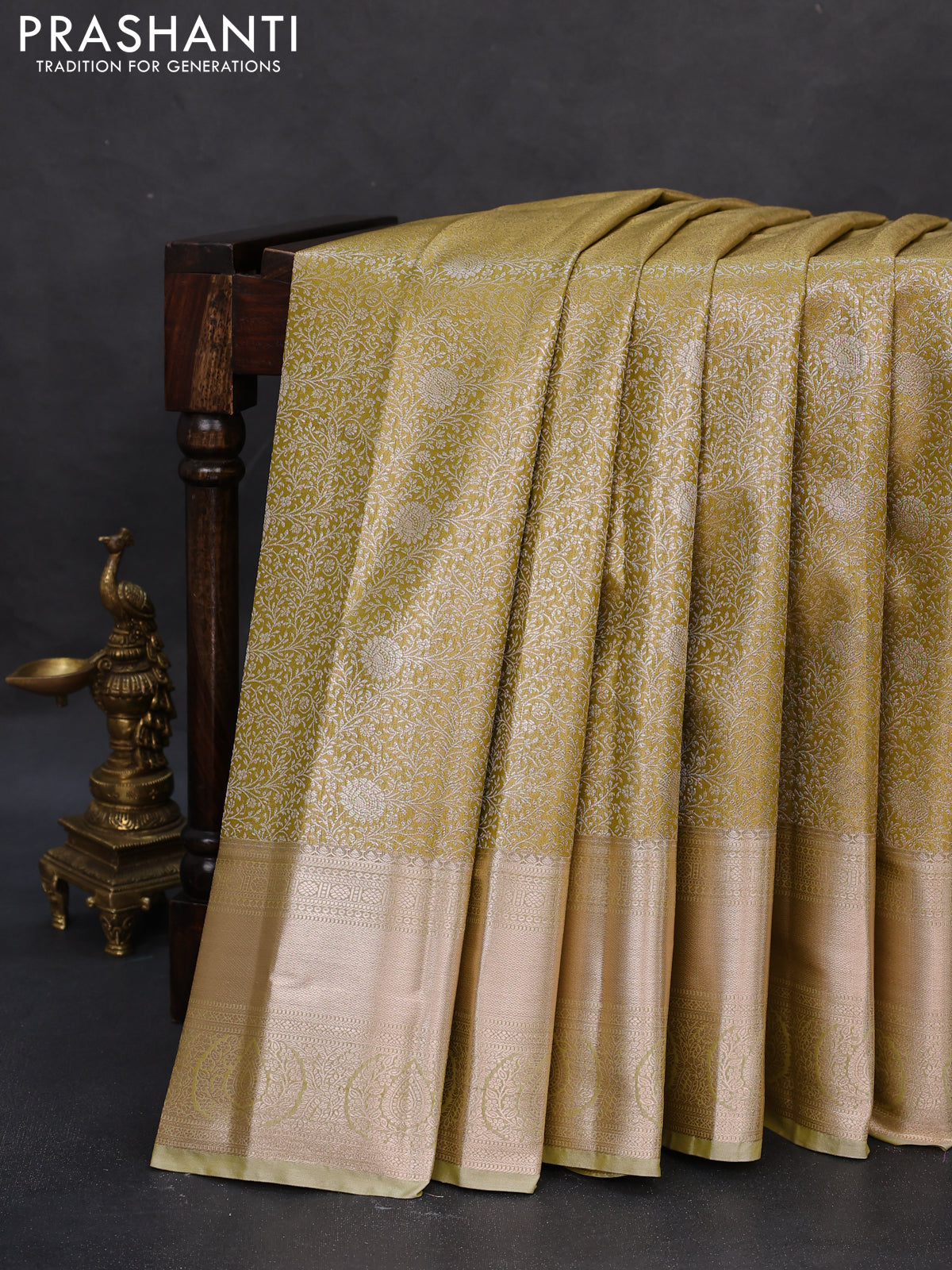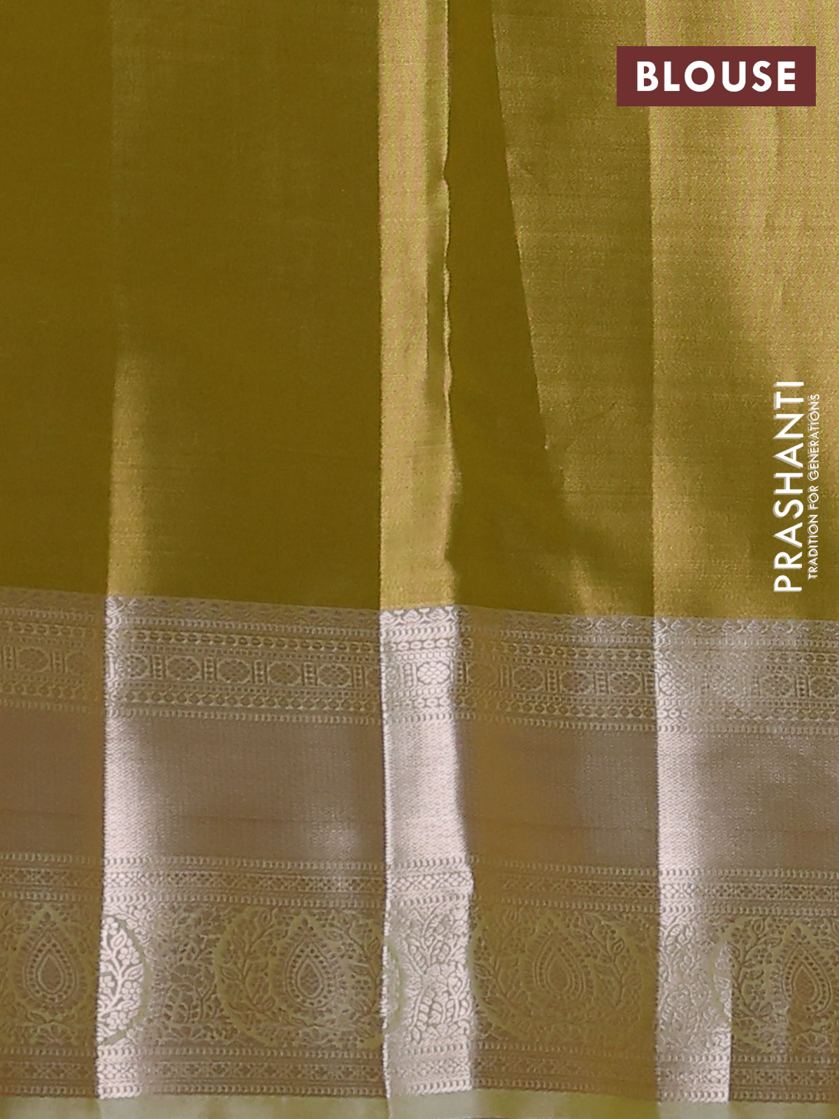 Semi kanchipuram tissue silk saree lime yellow with allover silver zari woven brocade weaves and zari woven border