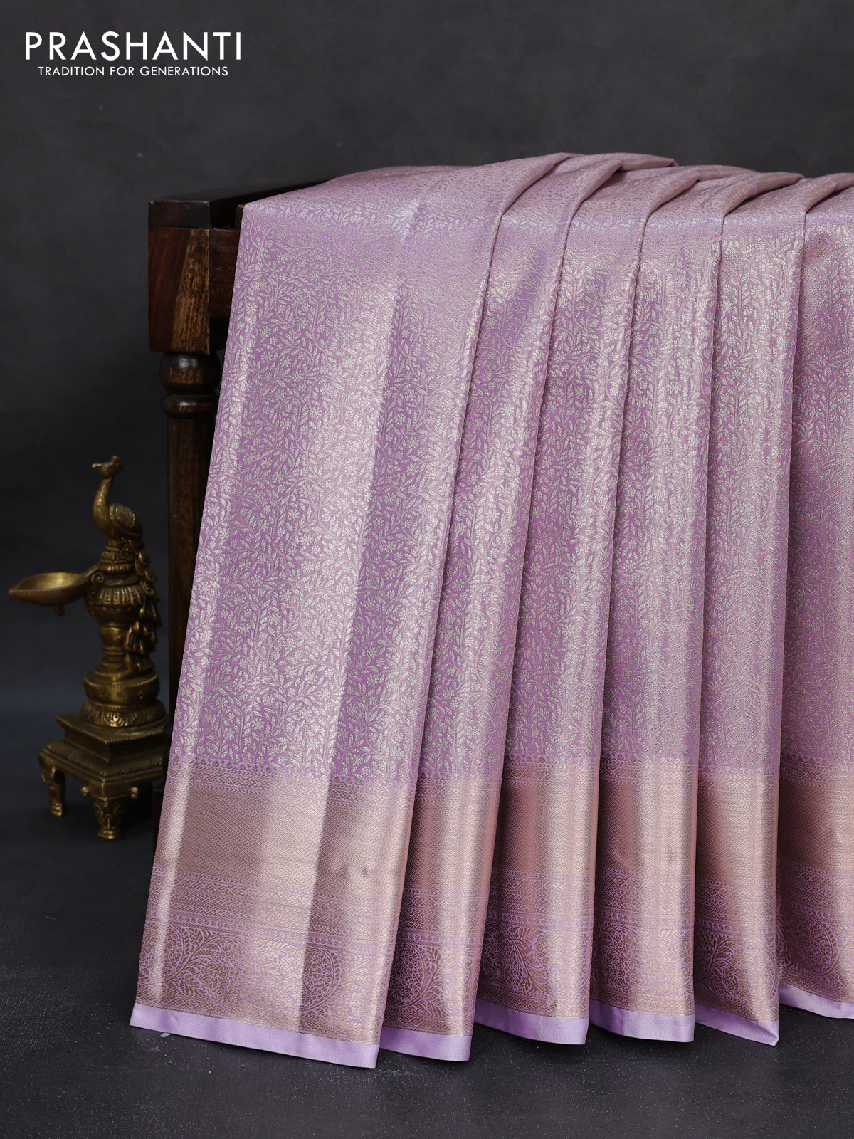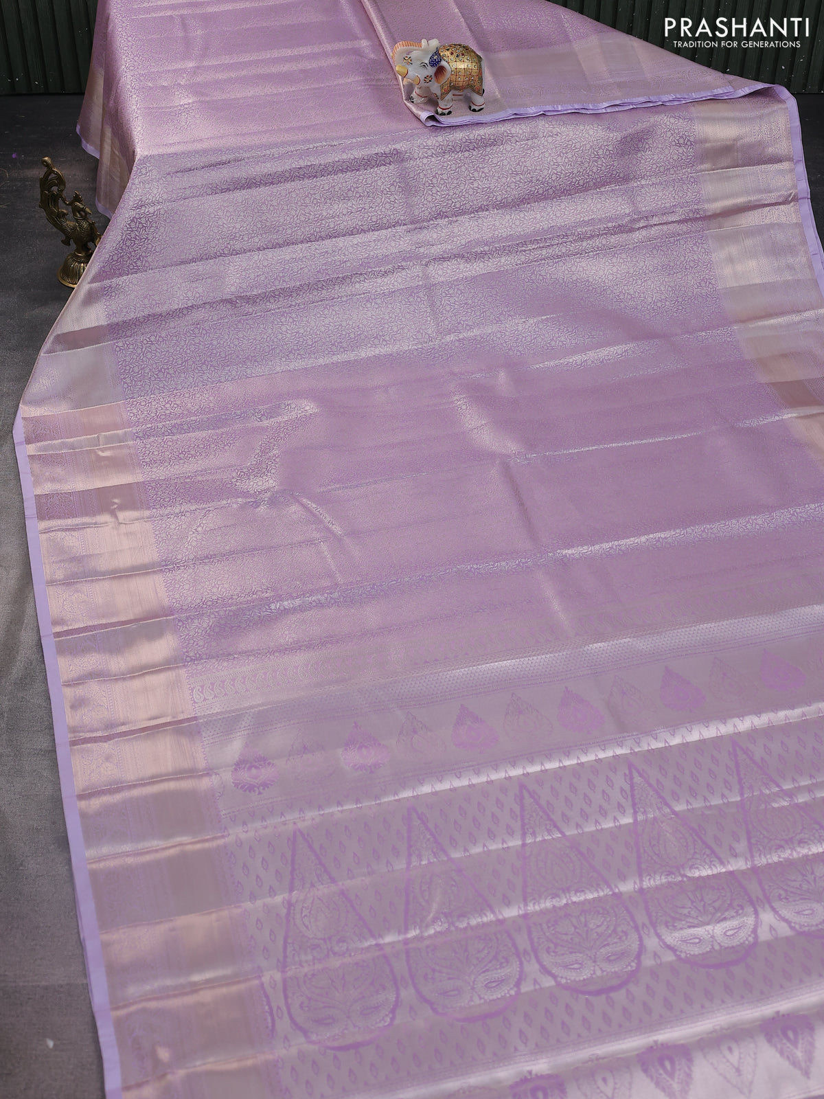 Semi kanchipuram tissue silk saree mild lavender with allover silver zari woven brocade weaves and zari woven border